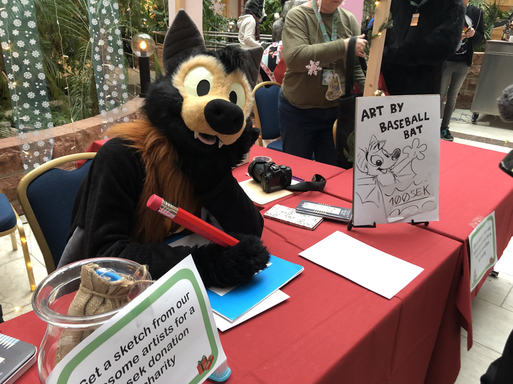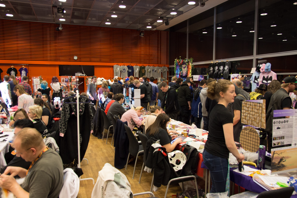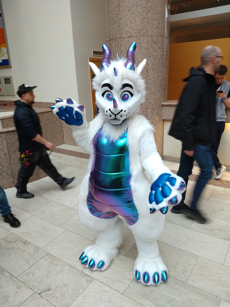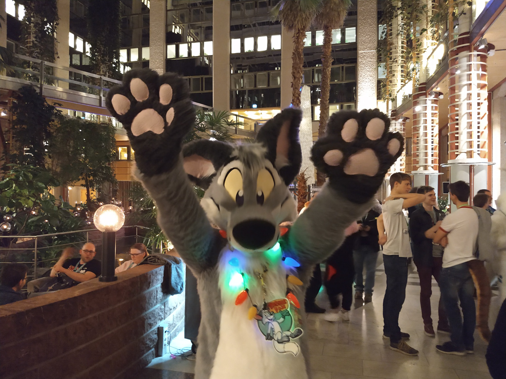 It was really windy and cold that day, so we quickly went back into the warm hotel. I went to the Artist Lounge while Henrieke went to get some waffles at the daily waffle buffet with Ekorren. Ethan dropped by and commissioned me for a picture for a series of drawings where every artist draws something inspired by a line from song lyrics. I ended up choosing "Alles klar, Herr Kommissar!" by the Austrian singer Falco. I worked a bit more on Powerpoint slides for Powerpoint karaoke, then Yamavu and I got some fursuit badges printed by Shorty at ConOps. I went to the Dealers Den with Yamavu after, talked a bit with Yamavu, checked out Mag's table with Jym and looked if KittyFluff, supplier of fake fur, had any new exciting colors to offer.