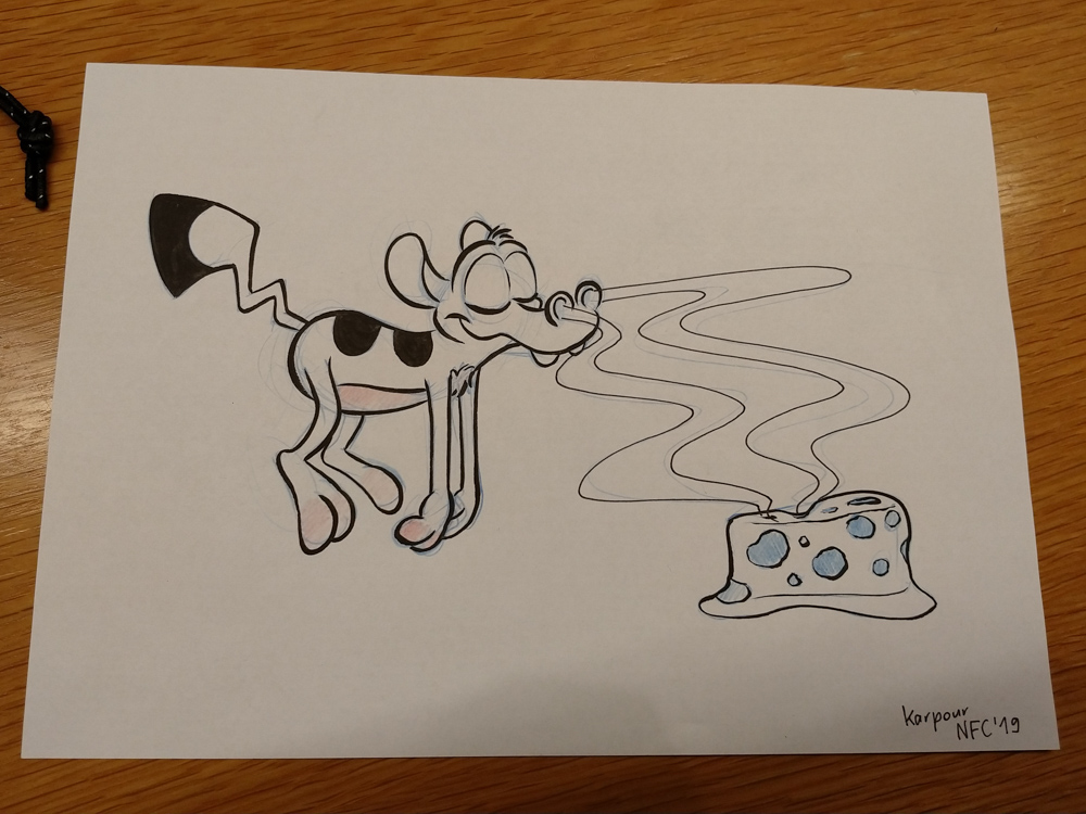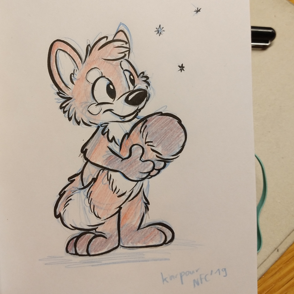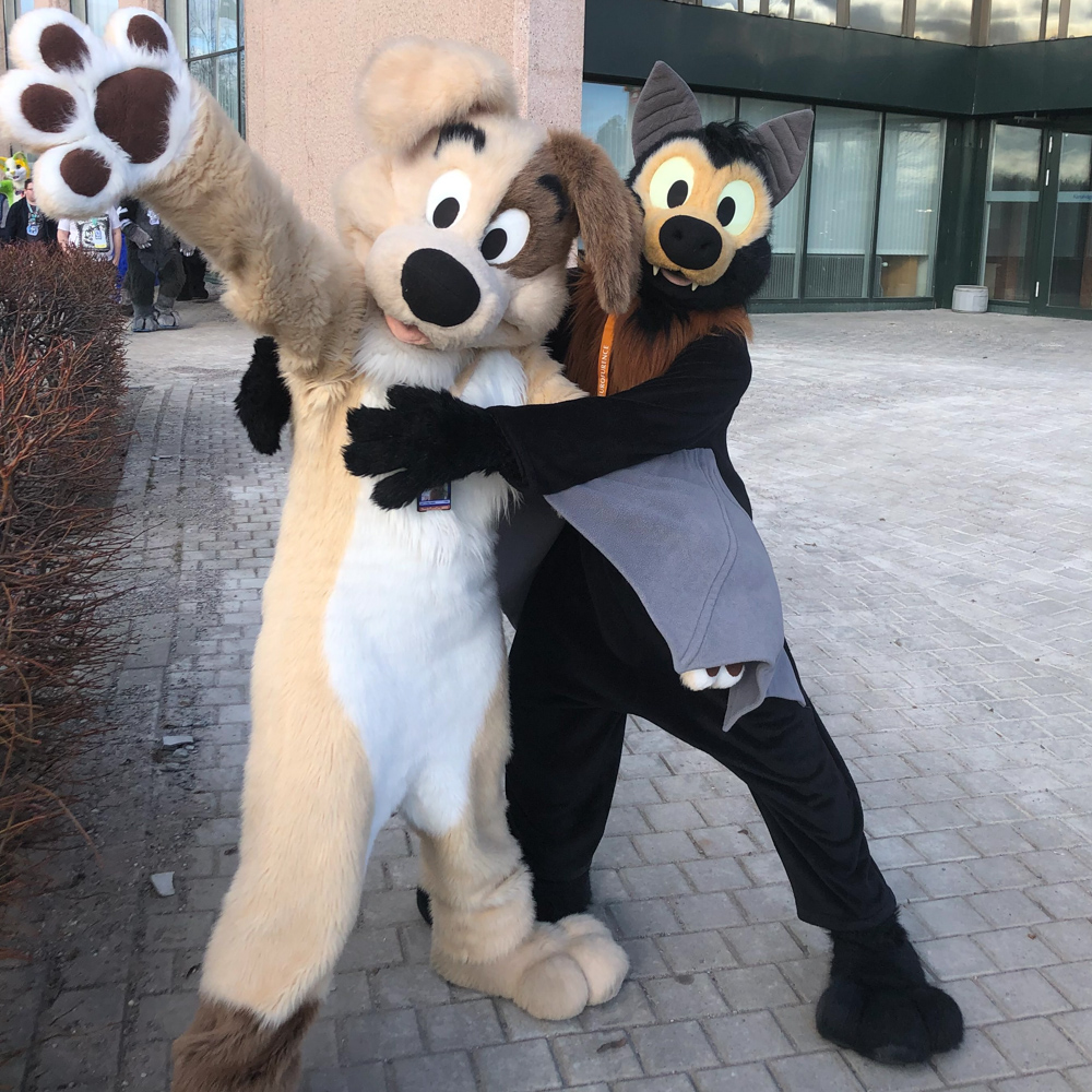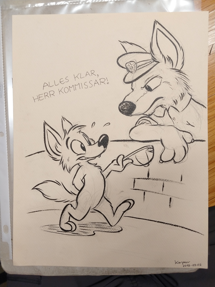 It was really windy and cold that day, so we quickly went back into the warm hotel. I went to the Artist Lounge while Henrieke went to get some waffles at the daily waffle buffet with Ekorren. Ethan dropped by and commissioned me for a picture for a series of drawings where every artist draws something inspired by a line from song lyrics. I ended up choosing "Alles klar, Herr Kommissar!" by the Austrian singer Falco. I worked a bit more on Powerpoint slides for Powerpoint karaoke, then Yamavu and I got some fursuit badges printed by Shorty at ConOps. I went to the Dealers Den with Yamavu after, talked a bit with Yamavu, checked out Mag's table with Jym and looked if KittyFluff, supplier of fake fur, had any new exciting colors to offer.
