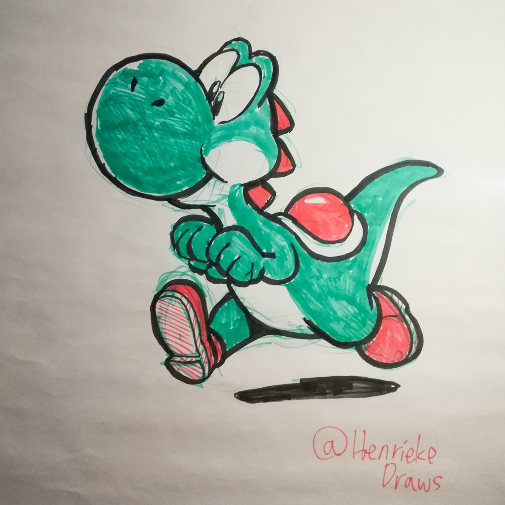 I went to the videogame room with Henrieke after that, then up to my room to grab a quick bite. Back at the arcade I tried Steel Battalion, a game with a very elaborate controller and a thick manual. I failed since I refused to actually read the manual. I played some Metal Slug and Bomberman 94 with Paco. Bomberman is great because it has adorable kangaroos in it! In the meanwhile, Henrieke drew a cute Yoshi on the Flipchart.