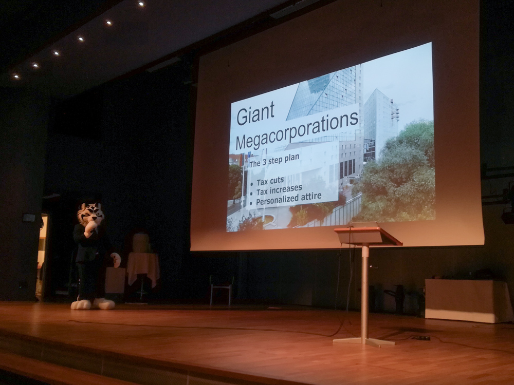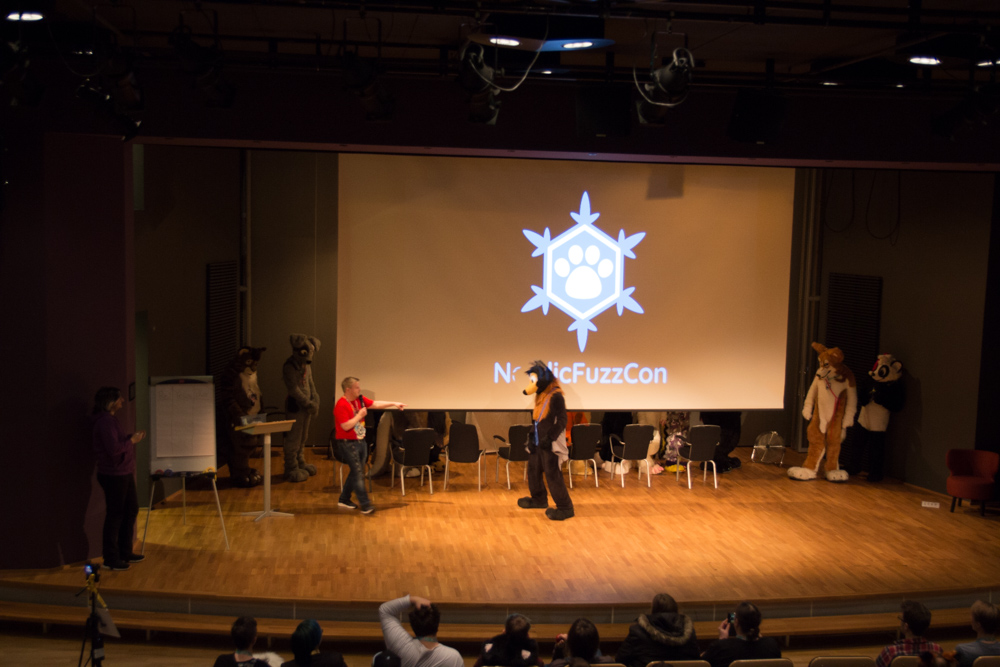 We originally intended the event to be in a small panel room, but it turns out that we got a slot on the main stage. Sadly due to some miscommunication, the main stage was in no state to be usable, but Fotofur managed to get things ready in time for our event to start. There were quite a few people attending, and the big stage certainly helped with making the presentations look more legit. I watched together with Henrieke, Mag, Yotie, Yamavu and Procyon.