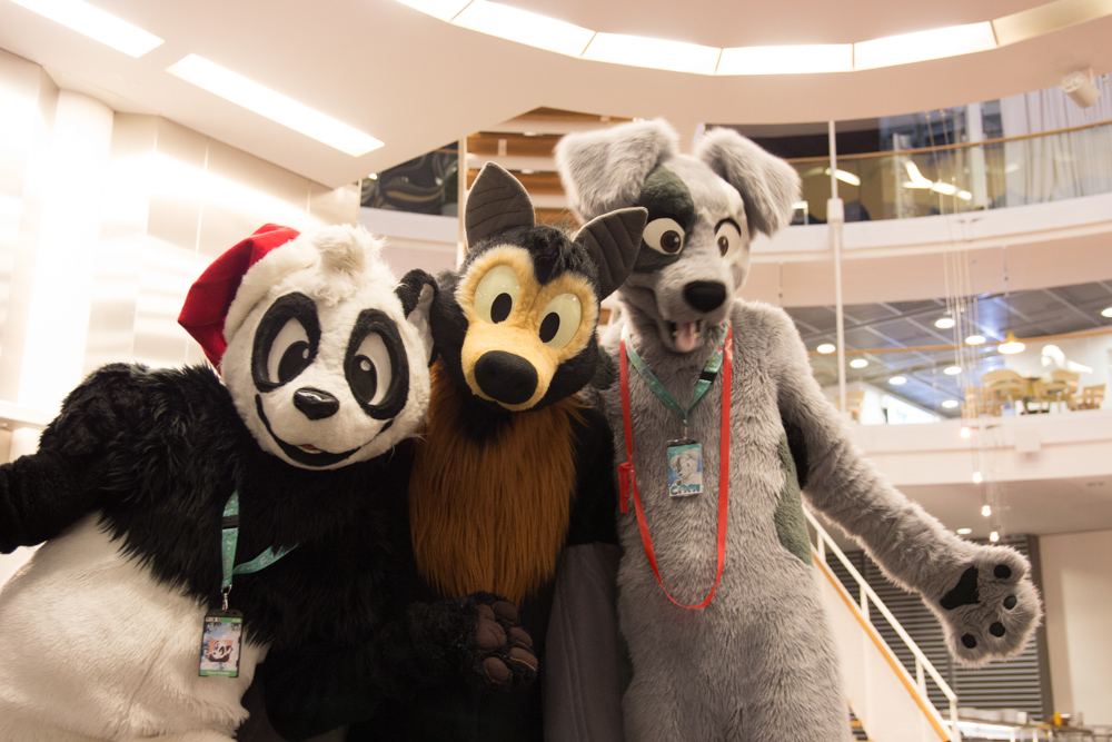 There was a Chinese girl who offered dried fish, which was pretty tasty! Henrieke and I went up to the room to get Baseball and Dog for the fursuit group photo and parade. They made it just in time and met Paco on the way.