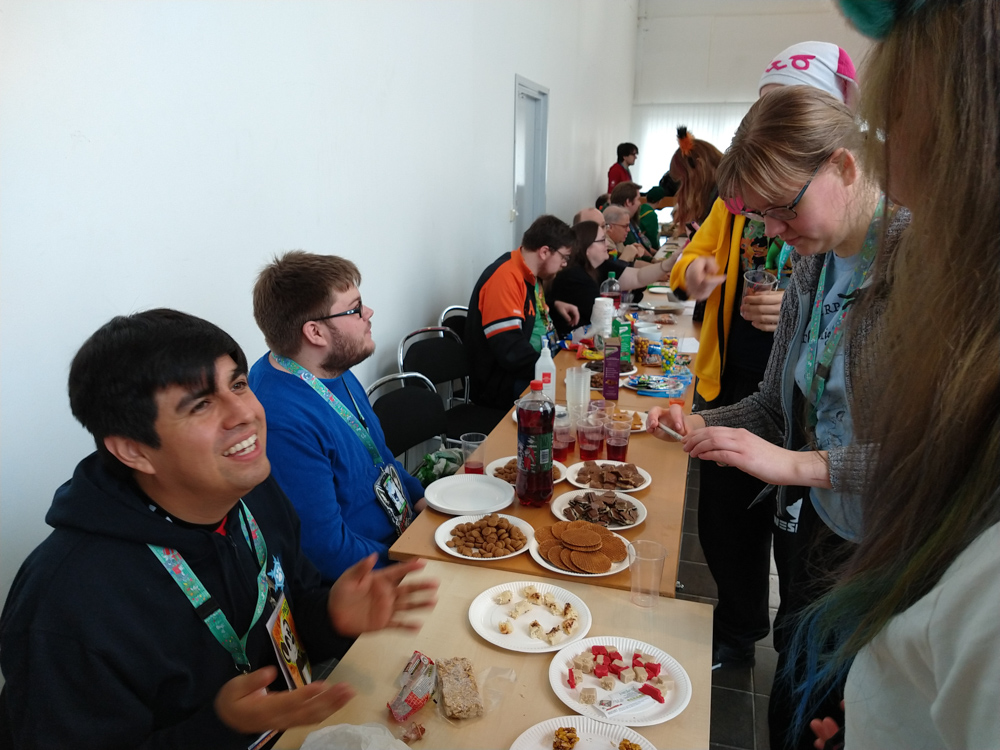 We got up at 10:00 and had breakfast together with Yamavu, Coorandilla and Procyon. Tasty scrambled eggs and bacon, some fruit and pancakes with strawberry jam and whipped cream, yum! No way I'd miss this even once at this con. Henrieke went to the art show. Like every year, the snack exchange was a very important event, with everyone bringing snacks from their home country. Paco brought some tasty Mexican treats and I probably ate more weird things than my stomach could handle.