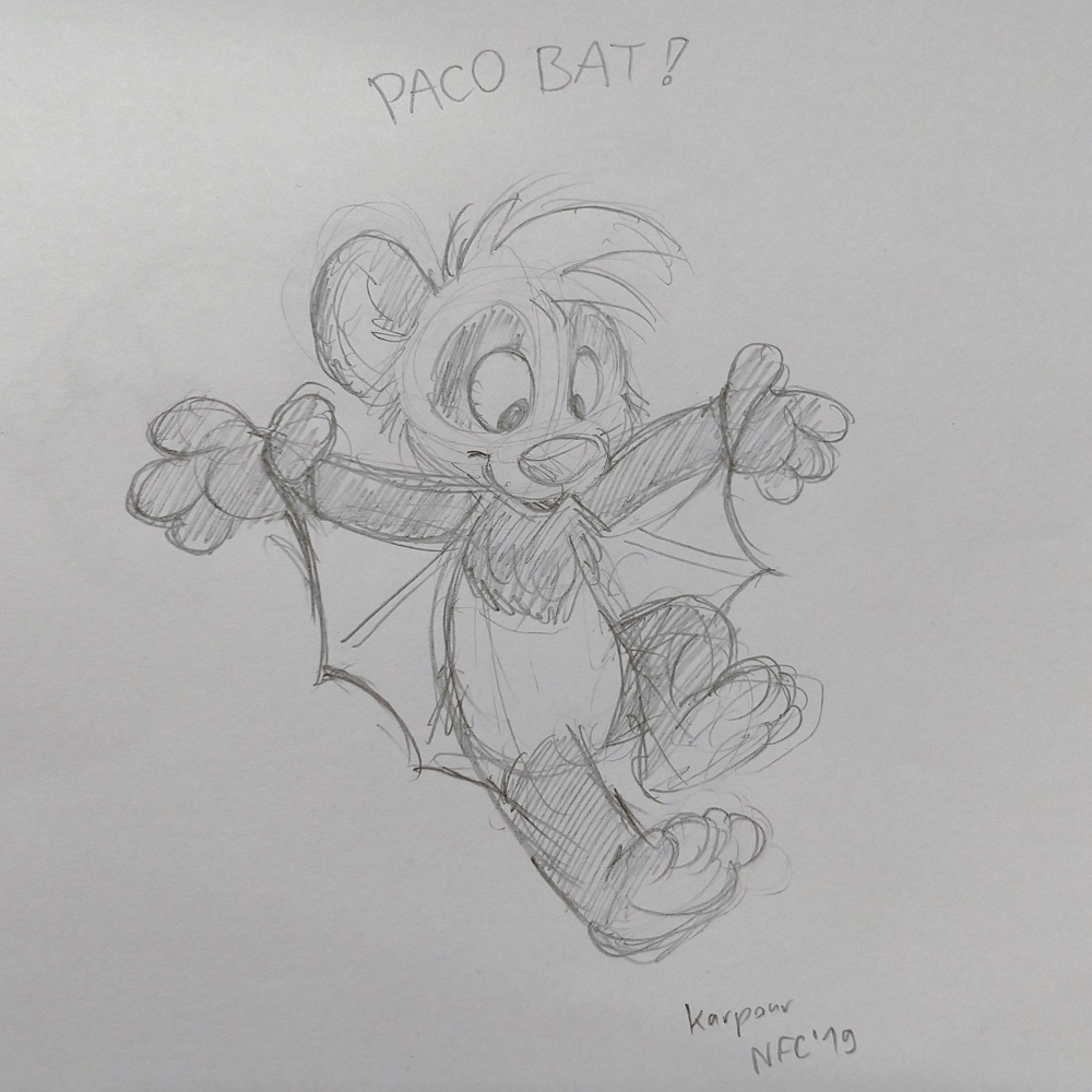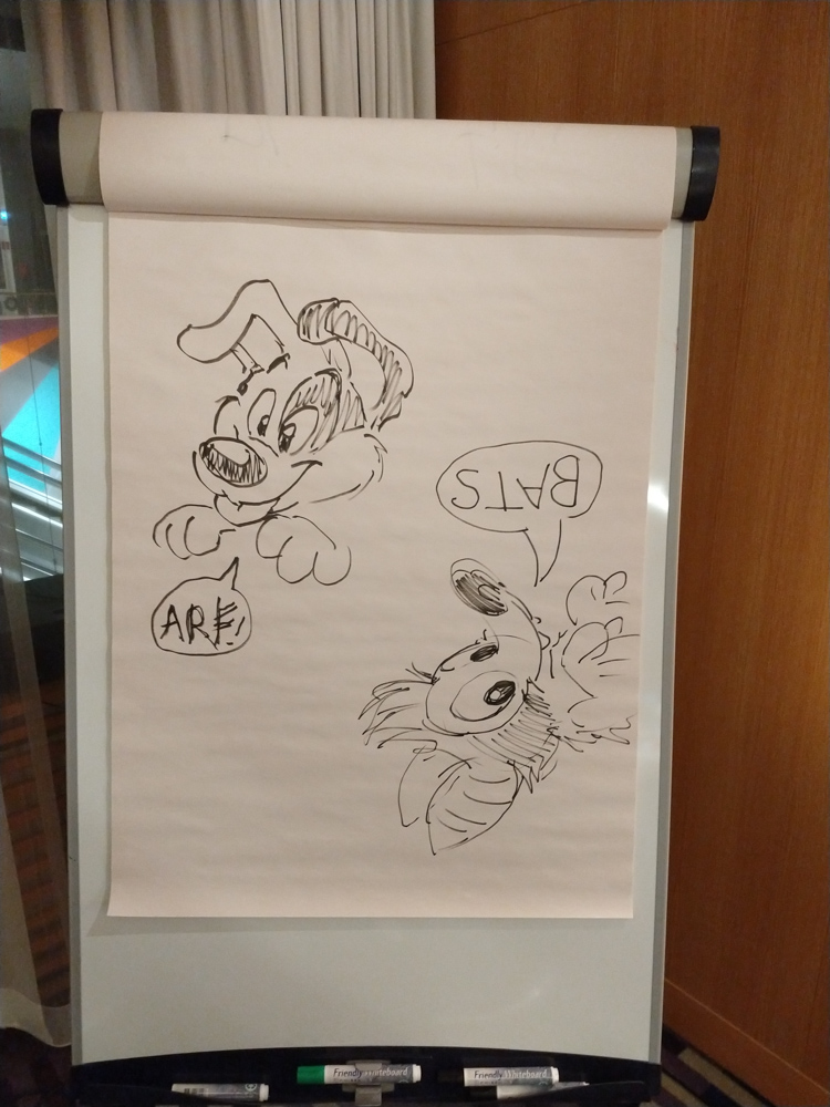 After that I went to ICA with Yotie and Mag and got a salad and a smoothie. I had my healthy dinner in their room while watching some Chinese TV show. After dinner I did an art trade with Flacko in the Artist Lounge, Paco was there as well creating adorable art as he always does. I went back to the arcade and played some House of the Dead on a Dreamcast with Yotie. He also made me try Space Channel 5. To prove a point we tried both Unreal Tournament and Quake 3, which were as expected horrible to play on a console. Though the Dreamcast did have mouse and keyboard support, so with those it might be playable. I hung up some of the drawings people did on the flipcharts and slowly the outside wall started becoming a little video game art gallery! Henrieke was at the auction, and I just dropped by at the exact moment her drawing of a fennec was up. A bid war ensued and the drawing went for a pretty nice amount! After that I wandered around a bit and followed up on an invitation to the Penthouse, an insanely huge suite on the top of the hotel where Trax and some other people were staying. There was a big party going on and I made some sketches for some people. Sadly a headache made my evening less enjoyable, but some ibuprofen took care of that. Later I went down to the lobby again and joined Yamavu, Yotie and Henrieke at a table at the Koi pond. Tabbie joined and we watched a Tex Avery cartoon about planes and the cutest Sylvester cartoon. Procyon and Atkelar joined too and I made the final Powerpoint slides with Yotie.