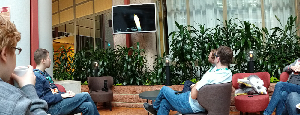 Today was the launch of a SpaceX Falcon 9 with the first crew dragon capsule. Unmanned of course, but still a historic launch. A few people organized a launch party in the lobby. I gave up on sleep and went downstairs to watch it together with people.