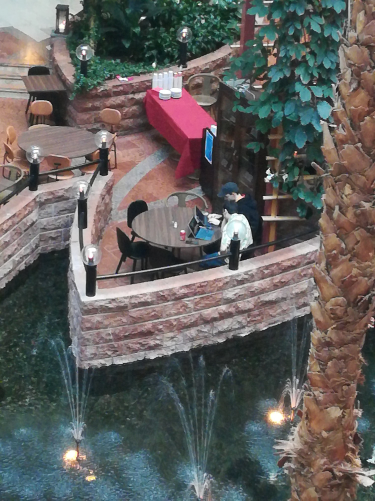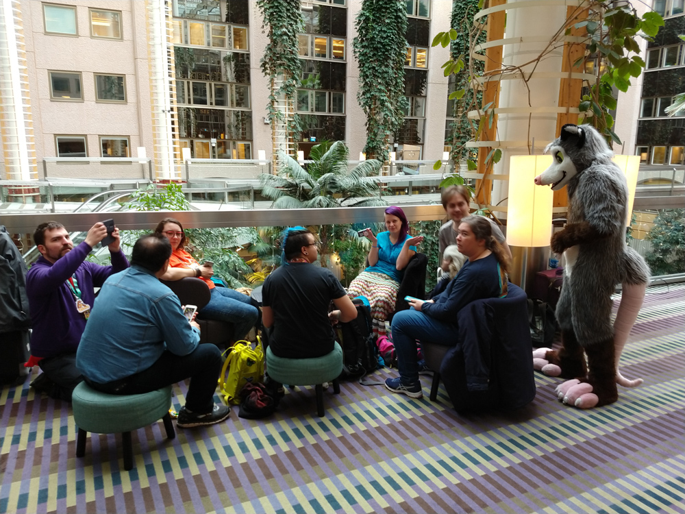 At the breakfast table I sat with Tracy and Lance and we talked about JPL until 11:30. I sat in the lobby with Yotie for a while, then brought some waffles for Henrieke. For lunch I went to MAX with Yamavu, Paco and Yotie and brought an espresso caramel shake to Henrieke, which she shared with Ekorren. I went back to the lobby and chatted with SlyCat for a bit, then met up with Yotie on the 8th floor. Henrieke was still feeling sick, she definitely caught the flu that was going around at the con. Luckily the comfy couches were enabling her to at least hang out with people for a bit today.