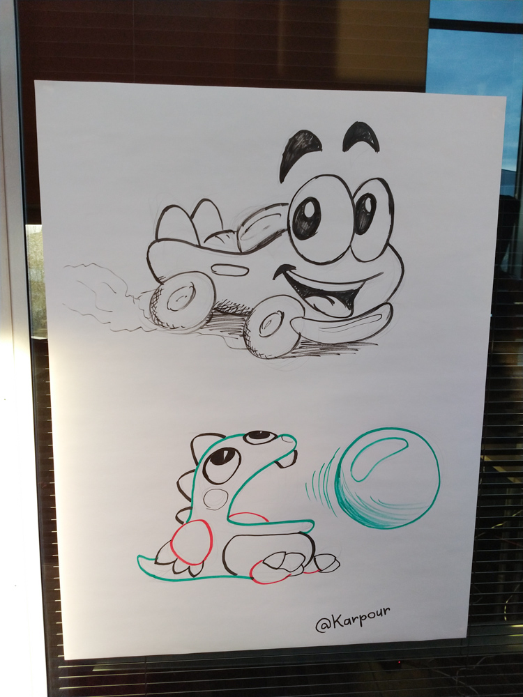 I went outside with Ekorren and Henrieke to do an easy raid at the Pokémon Gym outside the hotel and got a Dratini. After that I went to the arcade and looked at all the new videogame drawings people did, then I met with Yotie to finish things up for Powerpoint Karaoke.