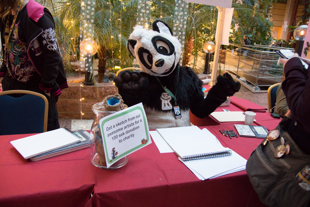 After that I went to check out the inflatable panel, but sadly no Sea Dragon was there. I chatted a bit with Layown, Sonny and Dracky and then met up with Shorty for some suiting. Baseball and Dog went roaming around the lobby a bit and also dropped by the Artist Lounge and the dance floor. Around midnight they went up to the room again. I went downstairs, ran into TomKitty and talked a bit, then found Henrieke, Tracy and Ekorren at the breakfast area. We moved to the Artist Lounge where Paco and Yamavu were already drawing.