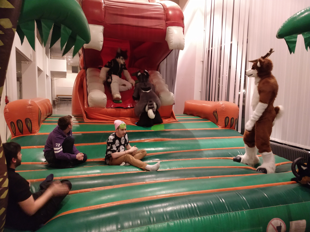 For dinner, we went to Subway with Ekorren, Yamavu and Paco after dropping by at the candy shop. Yotie also joined us to the candy shop. We got some gross Salmiak candy for Tabbie. Back at the hotel, I worked on some more slides with Yotie, then got Baseball down for his favorite event, Fursuit charades. The wait in front of the main stage was long, but luckily Paco was also there to make time pass faster. Baseball was in a team with Trax (which was odd, since the human Trax was hosting the show), Ryotsuke, and someone who's name I don't know.