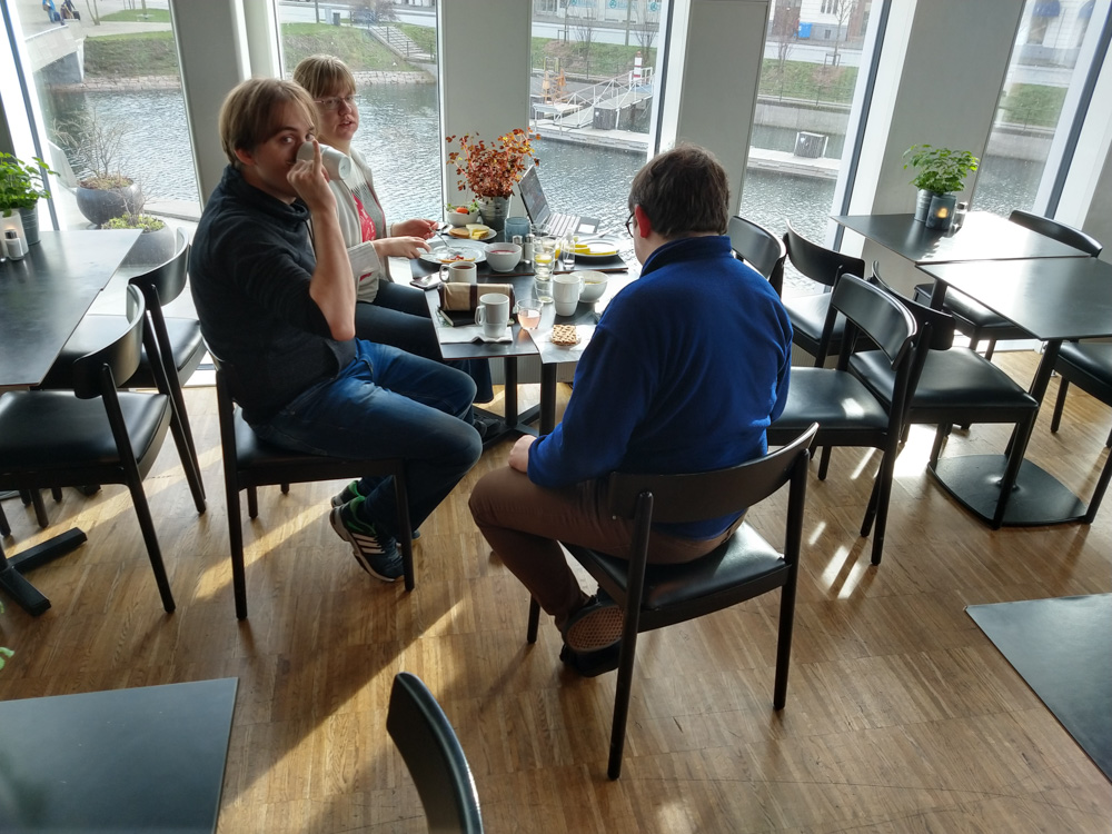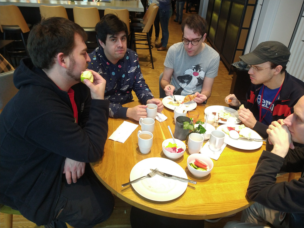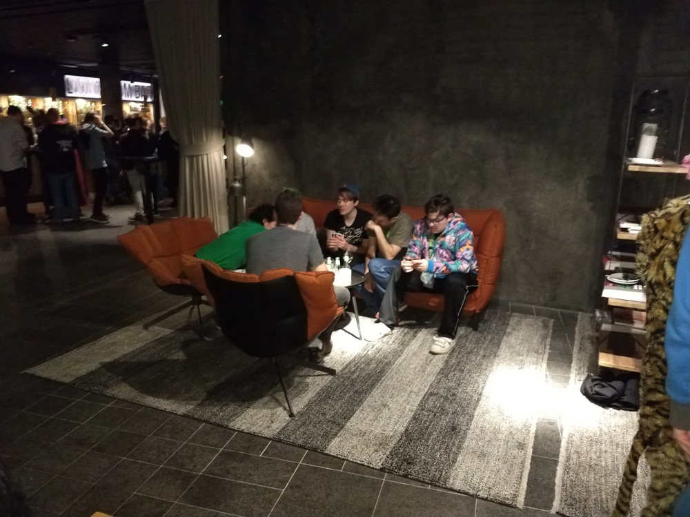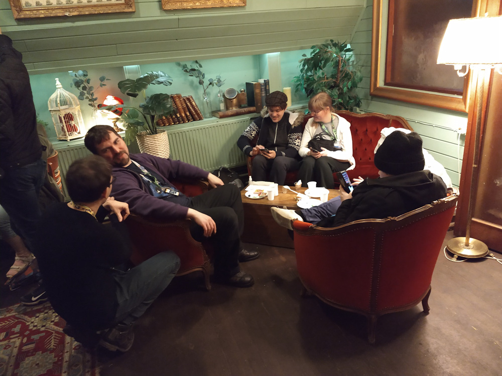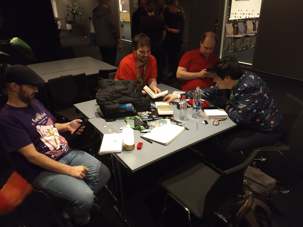 After that, we went to check out the convention space in the fancy new hotel! Sadly I still had to get work done today, so I spent most of the time sitting at a table in the lobby next to Henrieke, who worked a bit on her Brer Rabbit comic. Skippy dropped by and stayed around for a while, which made working at a con much nicer! He also brought some Raspberry Pi accessories and Almond M&Ms from the US for me, which was really nice! I had some fruits from the breakfast buffet for lunch, then Yotie and Mag dropped by and we created some slides for Powerpoint Karaoke together, which Yotie was organizing again. I continued to work for a while after that, and then did one more presentation together with Mag. At 17:30, Henrieke, I and Ekorren met up with Joakim and Hedvig, two great artists from Göteborg we never met in person before.
