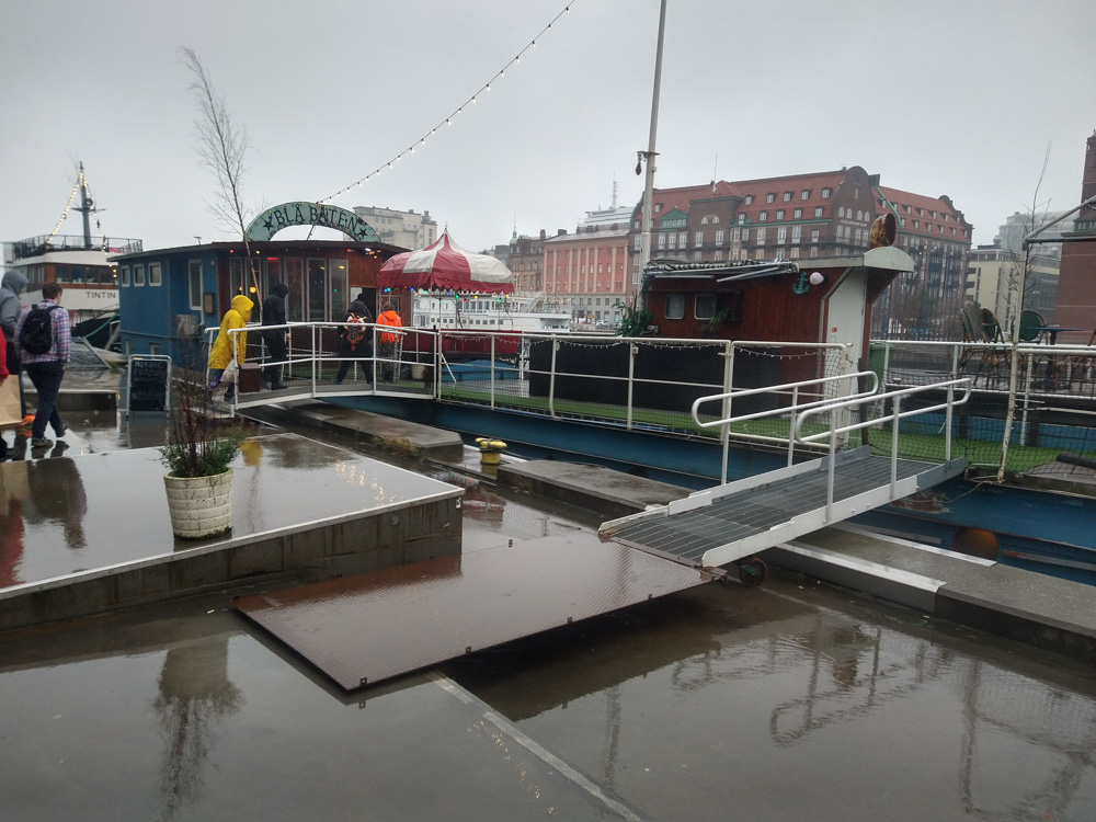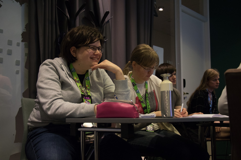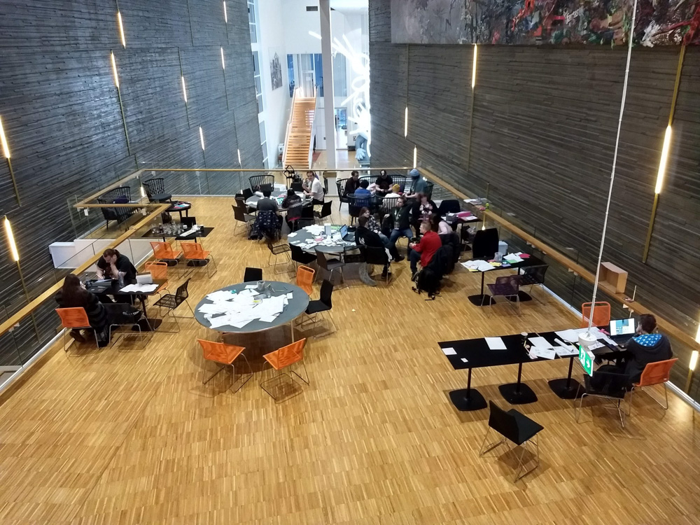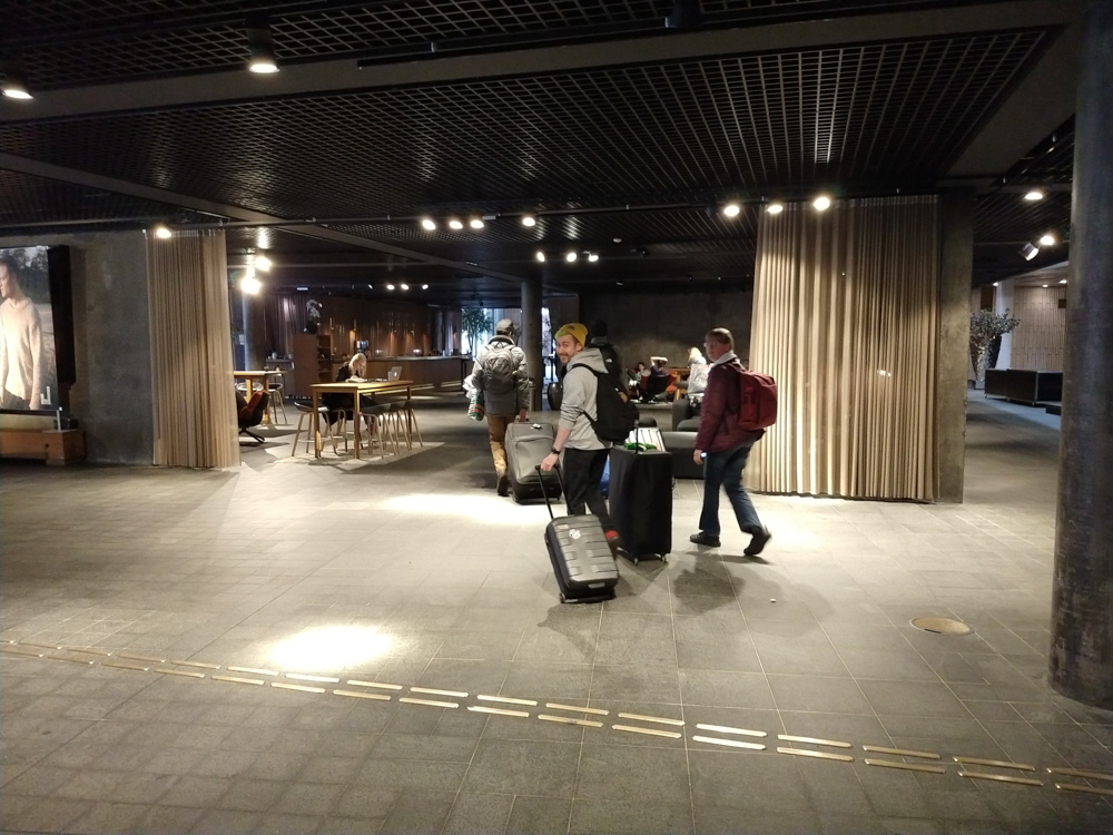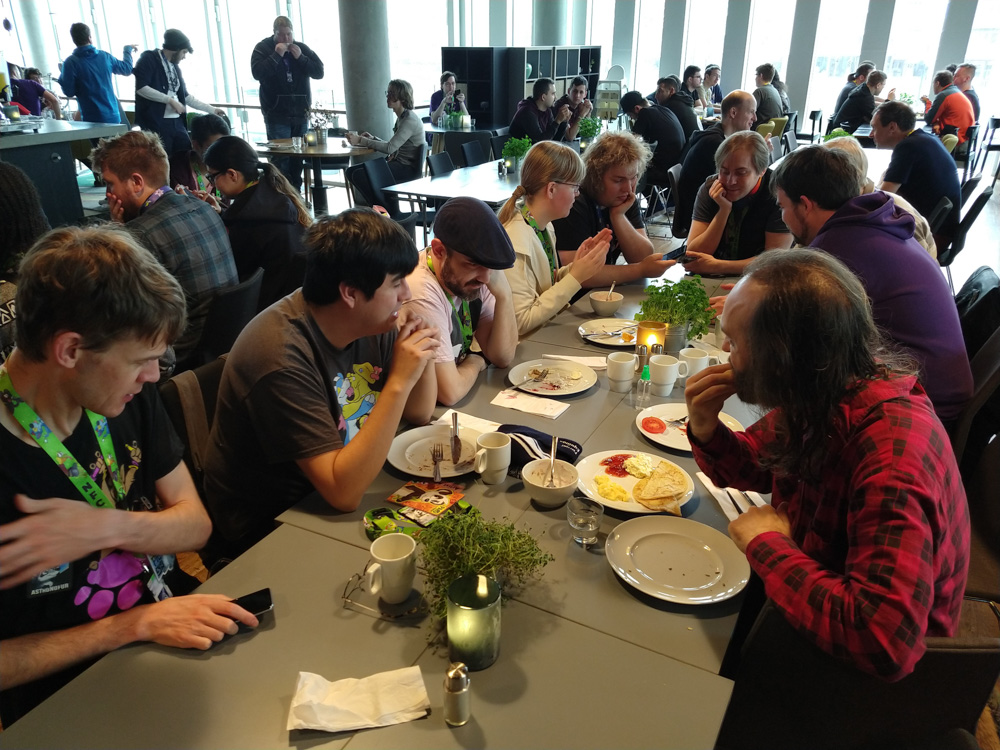 After that, we went to check out the convention space in the fancy new hotel! Sadly I still had to get work done today, so I spent most of the time sitting at a table in the lobby next to Henrieke, who worked a bit on her Brer Rabbit comic. Skippy dropped by and stayed around for a while, which made working at a con much nicer! He also brought some Raspberry Pi accessories and Almond M&Ms from the US for me, which was really nice! I had some fruits from the breakfast buffet for lunch, then Yotie and Mag dropped by and we created some slides for Powerpoint Karaoke together, which Yotie was organizing again. I continued to work for a while after that, and then did one more presentation together with Mag. At 17:30, Henrieke, I and Ekorren met up with Joakim and Hedvig, two great artists from Göteborg we never met in person before.