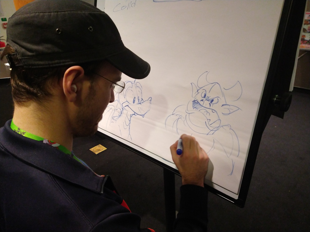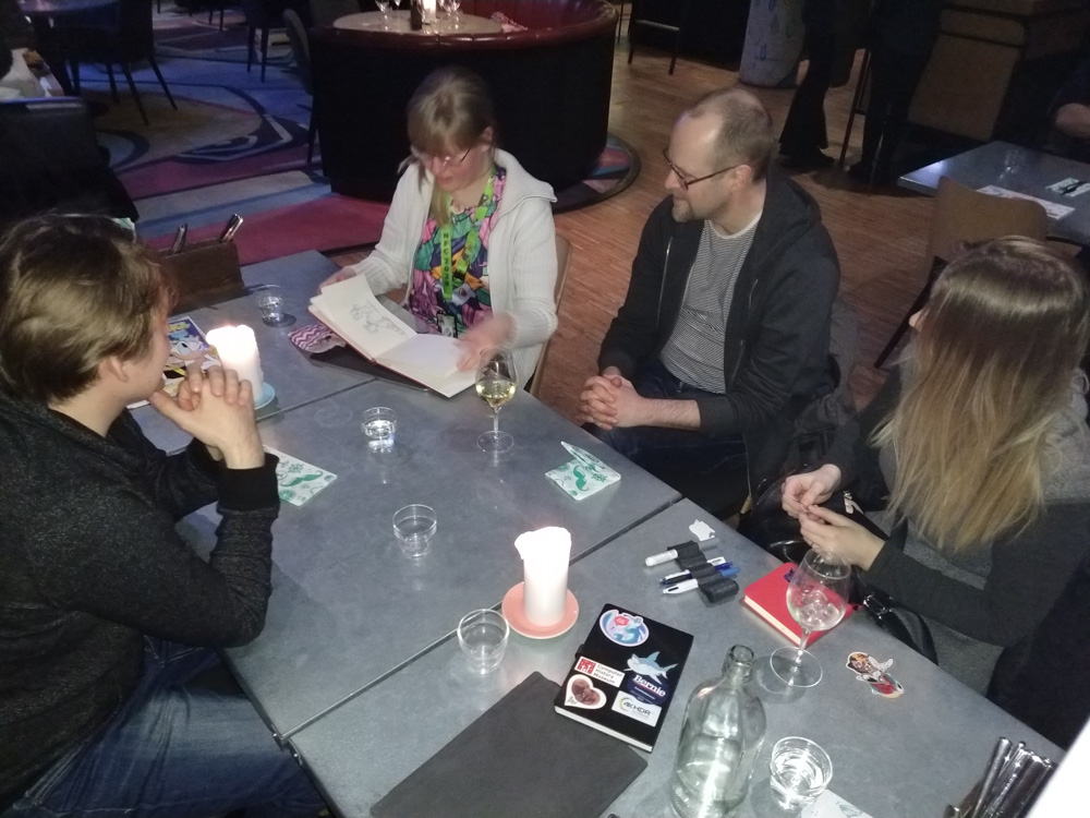 Henrieke, Chiros and Yamavu went to Caffrey's panel about drwing cartoons at 17:30, I stayed behind and chatted for a while with Kéké, who joined us earlier. I also did a nice art trade with him. Yotie and Mag dropped by, and at around 18:00 Mag and I also joined Caffrey's panel, which was very well attended.