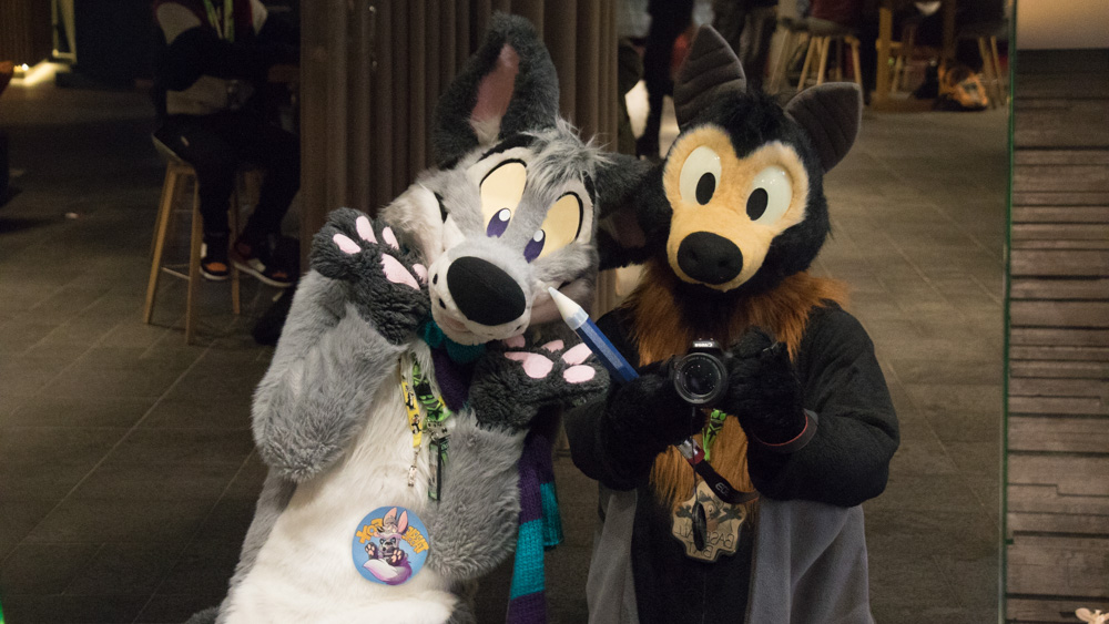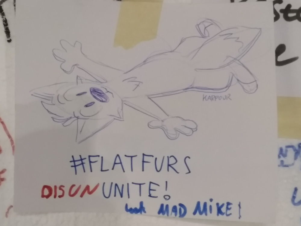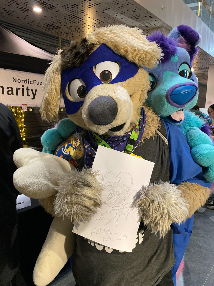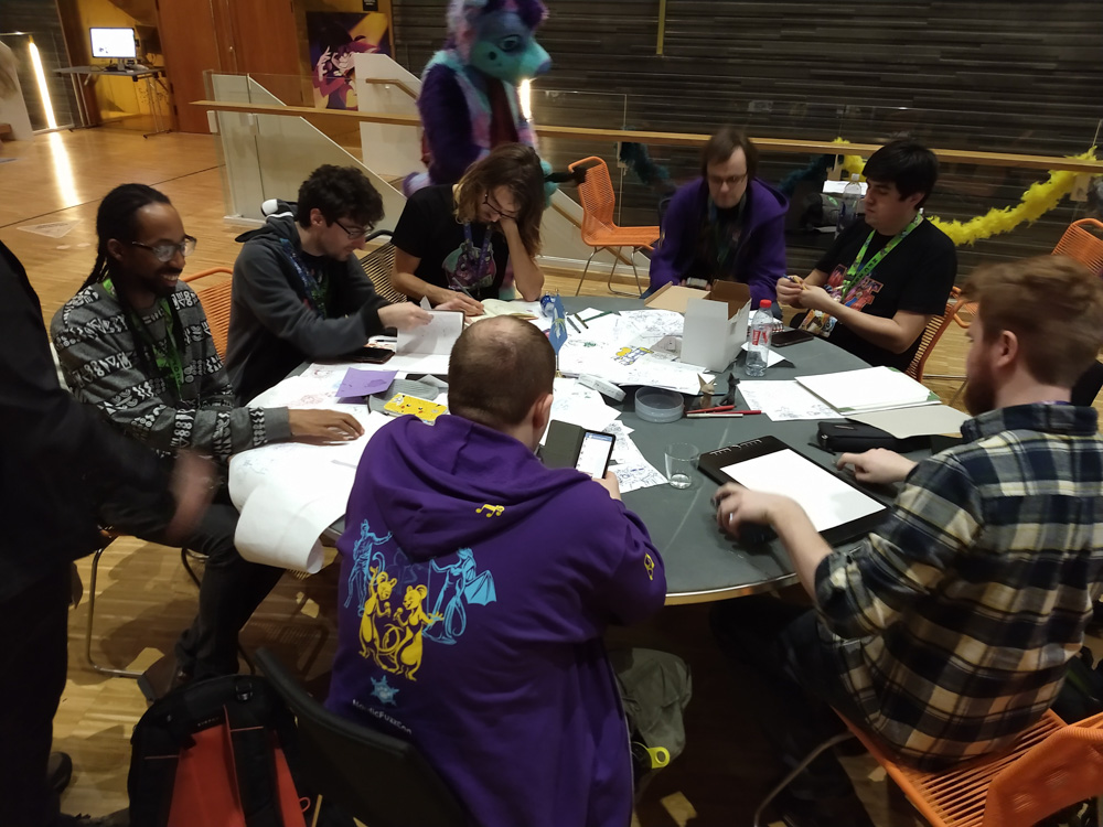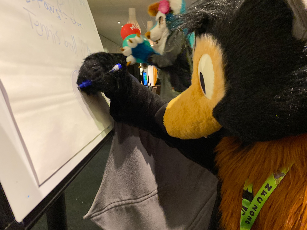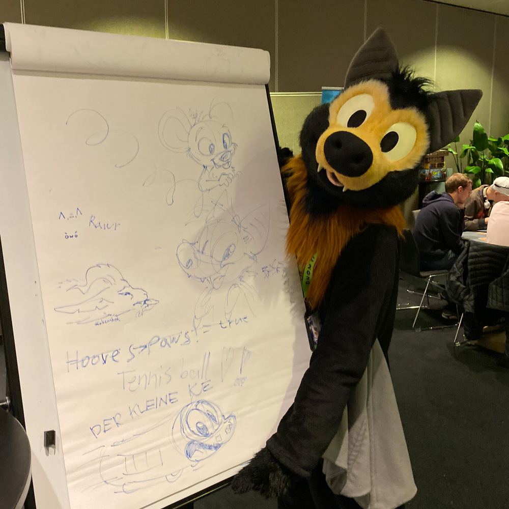 We somehow talked about Vargen, the cutest character of the swedish Bamse comic, and I had to introduce Paco to him of course. I wandered though the Dealers Den and suddenly got a message about something going wrong with the stream at my company. (I work at Chillhop Music and we run the famous lofi hip hop stream with the raccoon on the bed) The next 1.5 hours I spent fixing things on the stream, which wasn't too fun since the hotel wifi blocked VPN and SSH, and my other colleague who wrote the code I had to dig through didn't have a laptop with him. Eventually I moved from my room to the Artist Alley, wrapped up my Chillhop work and did some sketching together with Ekorren, Renée, Yamavu, Procy and Levi, who had arrived at the con not too long ago. I went to the Dealers Den again with Henrieke to say hi to Gatorguts, who I didn't see yet this con. I hung up a quick sketch on a styrofoam pillar in the lobby, supporting the sarcastic "flat earth furries" meetup that took place before the fursuit parade. I went to the arcade with Henrieke, sadly most machines were occupied, so we drew some videogame characters on the flipchart outside.