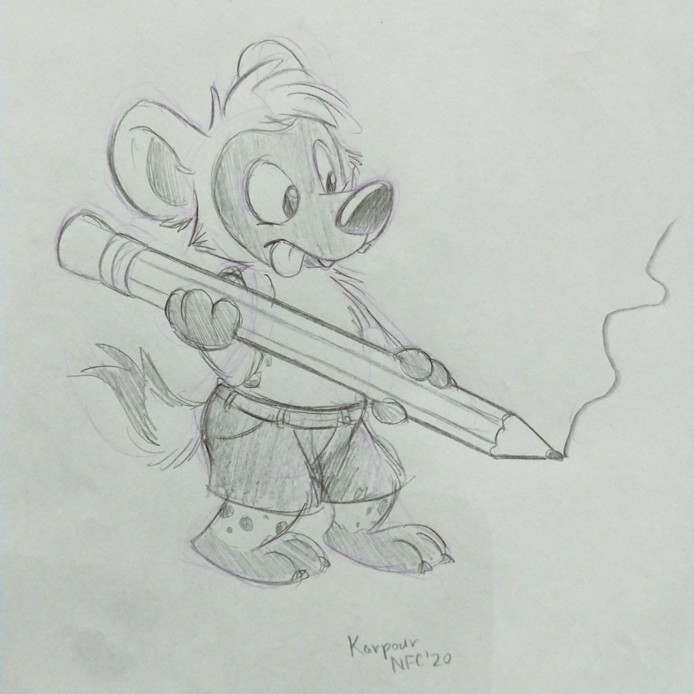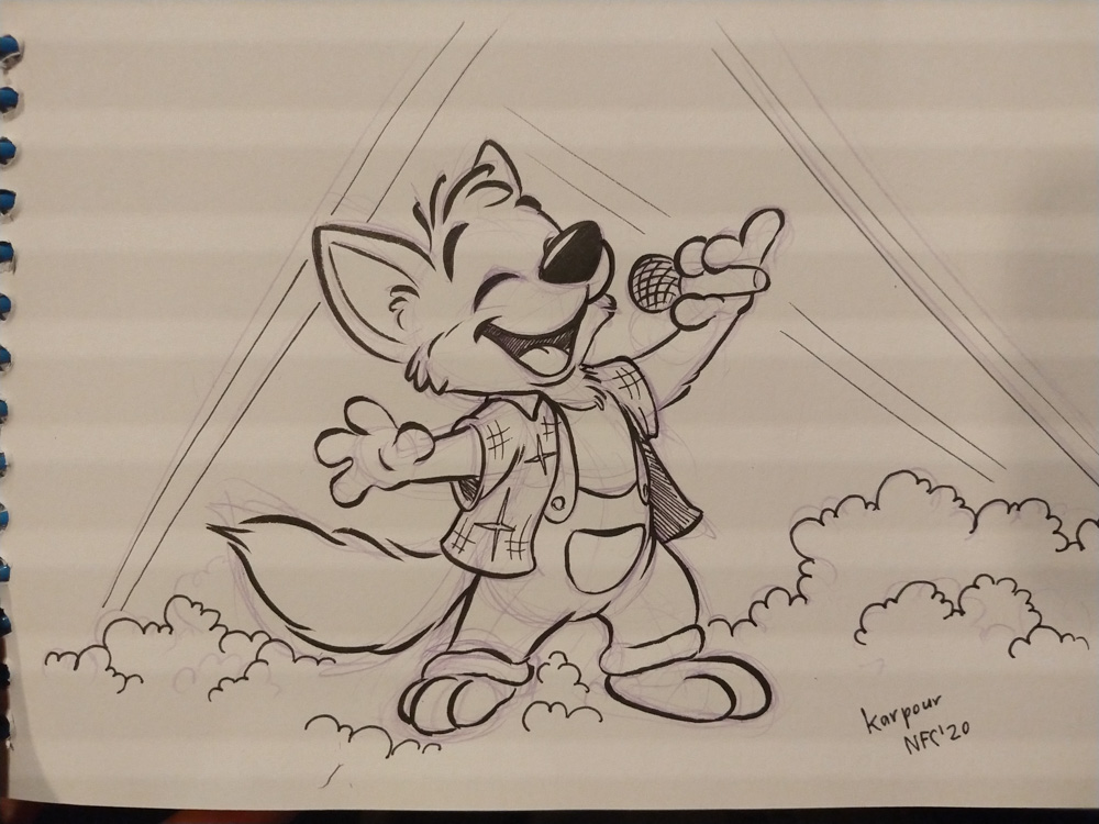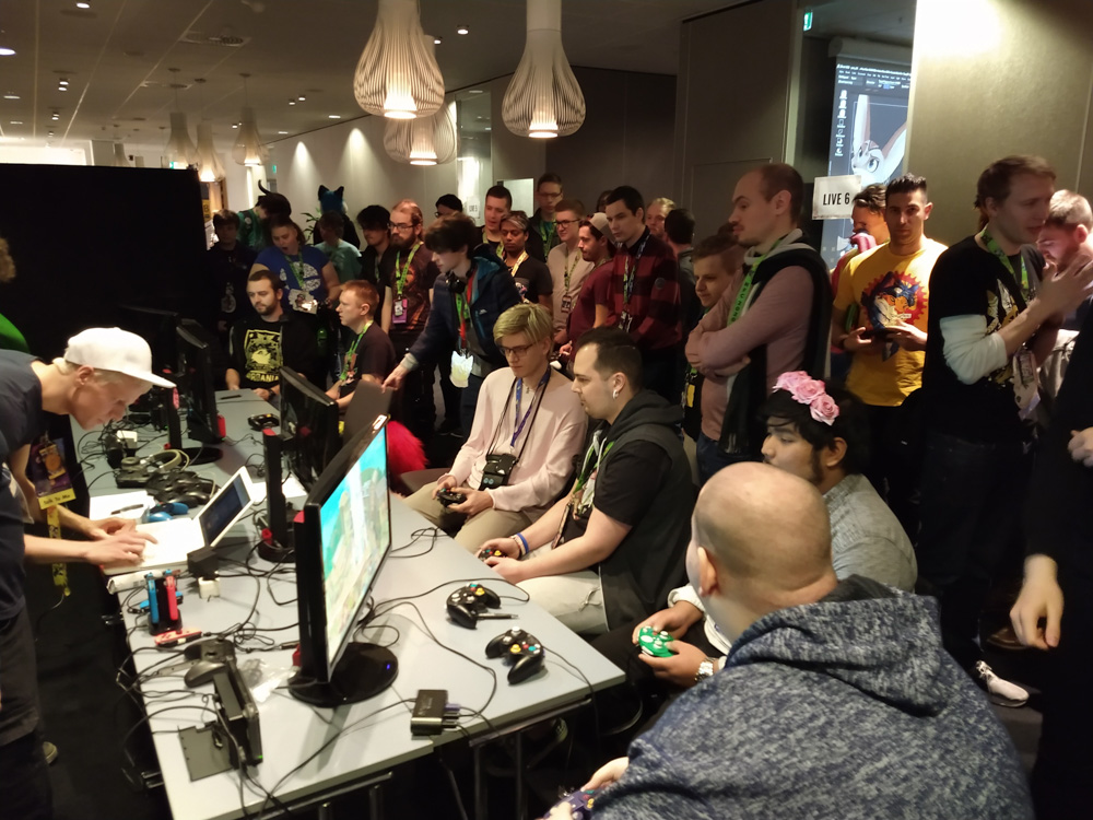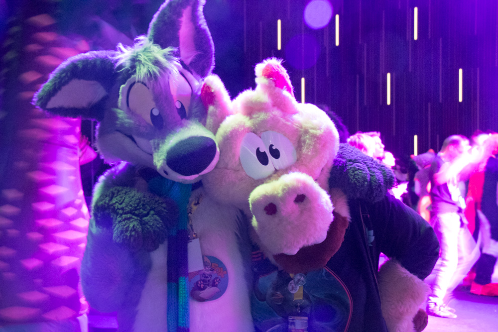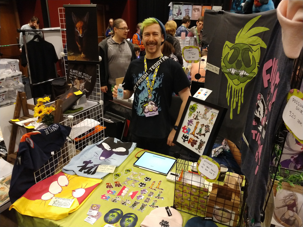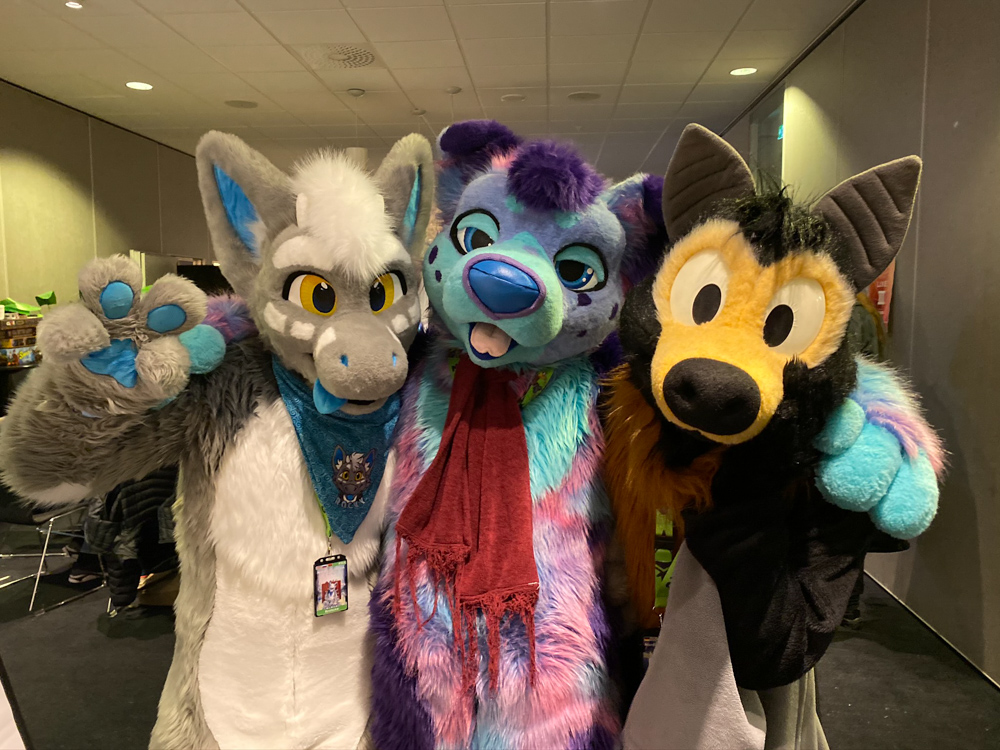 We somehow talked about Vargen, the cutest character of the swedish Bamse comic, and I had to introduce Paco to him of course. I wandered though the Dealers Den and suddenly got a message about something going wrong with the stream at my company. (I work at Chillhop Music and we run the famous lofi hip hop stream with the raccoon on the bed) The next 1.5 hours I spent fixing things on the stream, which wasn't too fun since the hotel wifi blocked VPN and SSH, and my other colleague who wrote the code I had to dig through didn't have a laptop with him. Eventually I moved from my room to the Artist Alley, wrapped up my Chillhop work and did some sketching together with Ekorren, Renée, Yamavu, Procy and Levi, who had arrived at the con not too long ago. I went to the Dealers Den again with Henrieke to say hi to Gatorguts, who I didn't see yet this con. I hung up a quick sketch on a styrofoam pillar in the lobby, supporting the sarcastic "flat earth furries" meetup that took place before the fursuit parade. I went to the arcade with Henrieke, sadly most machines were occupied, so we drew some videogame characters on the flipchart outside.
