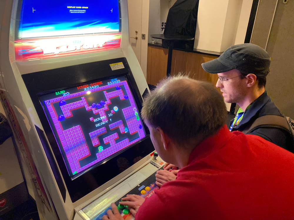I made a Furovision-themed drawing for Skippy and stayed until about 2:00. Henrieke and Mag were still hanging out on Tabbie's and Caffrey's room, watching 3 Caballeros. She joined us shortly before we went upstairs again. Before that, I made sure to play some Bubble Bobble on the arcade cabinet outside of the arcade though!