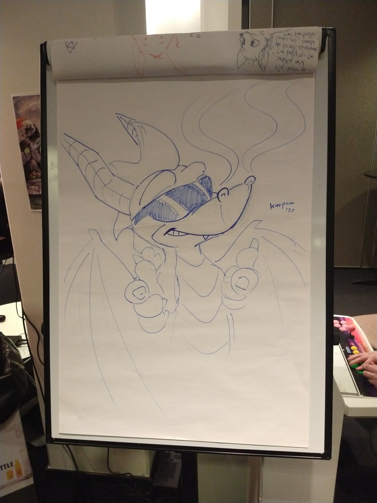 Henrieke showed us clips from the other Eurovision show where people would dress up in strange costumes and had to do tasks, similar to Takeshi's castle. I chatted about convention themes with Ethan a bit and stressed that there really should have been a 90s theme at a furry convention by now. We stuck around until 11:50, then I ran into Mausie and Iris and had to take some photos and make a drawing for them on a whiteboard. We also ran into Pico, the adorable red dragon!