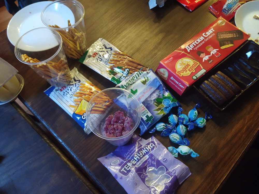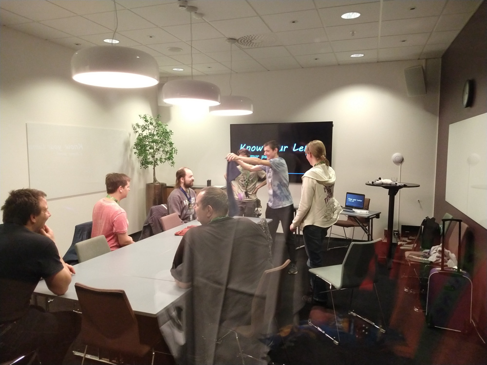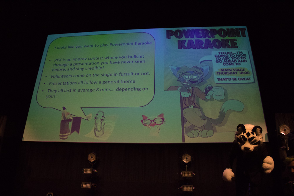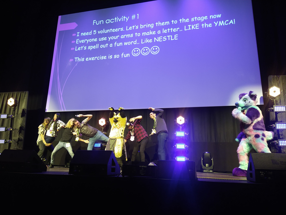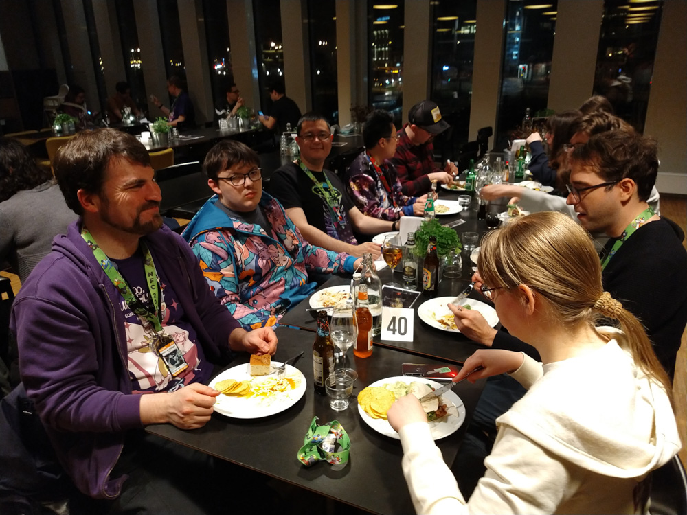 The snack exchange was nice as always, and I got to taste all kinds of cheeses, Israeli crisps, Chinese fish crisps, Dutch cookies and a lot more! We hung out on the boat for a while and then headed back, stocking up on snacks at 7-11 on the way. Back at the hotel, I helped Yotie with setting up Powerpoint karaoke at the main stage. The event was a lot of fun, my favorite was Brainfreeze who presented my "Nestlé 1999 winter teambuilding event" slides! The main stage was packed, and we easily had 10x the attendance of last year. I think I can safely say that there will be Powerpoint Karaoke next year. After that, I hung out with Mag, Yotie and Procy on Yotie's room.