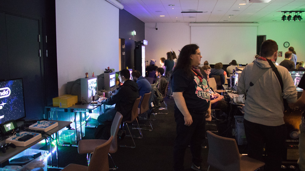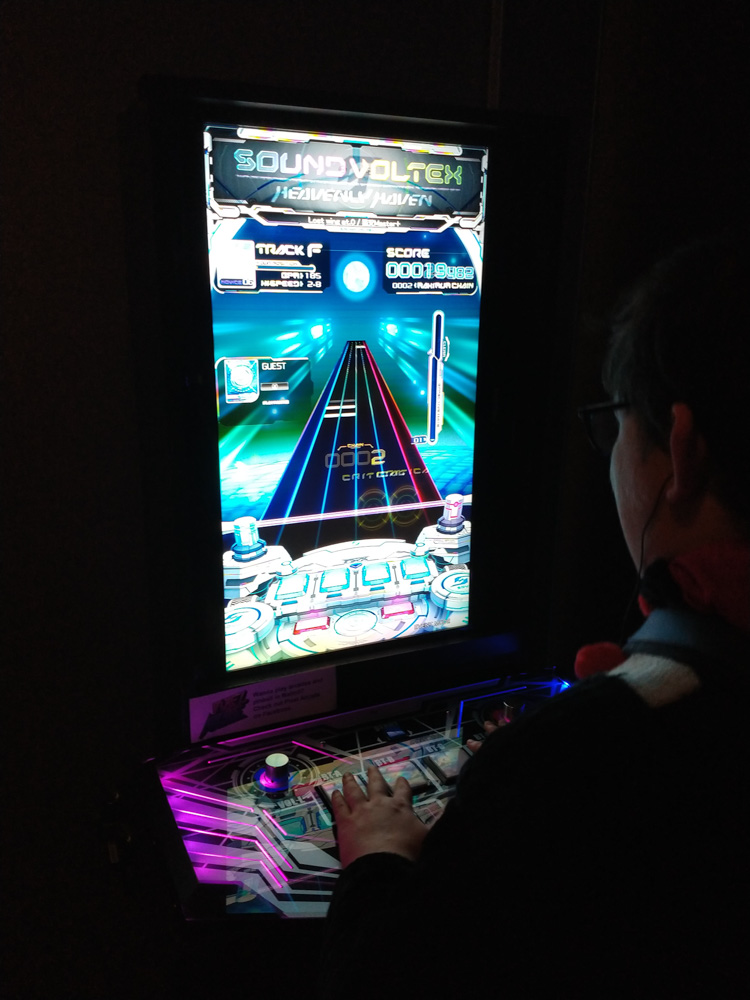 We had a very long dinner at the Taqueria inside the hotel and chatted a lot about art, furry conventions, The Three Caballeros and Bamse, a swedish comic of which Joakim is the editor of. Since I got an annoying allergy headache, I left a bit earlier and got a snack, a Red Bull and a painkiller, my usual allergy remedy. Luckily that helped. I ran into Yamavu and Renée, who were doing an art trade in the lobby. At 20:00, the arcade opened. The arcade is one of my all time favorite events at NFC, there are so many fun games to play there! I met Lynn and checked out the arcade together with her! This year they had DDR and Sound Voltex, a really fun Rhythm game we saw at Round1 a month earlier, but didn't dare to play. Since playing was free at NFC, I finally got to try is and it was really fun!