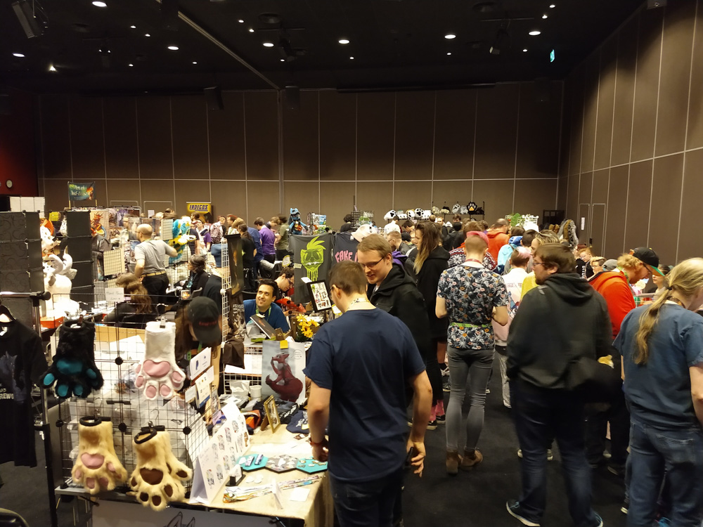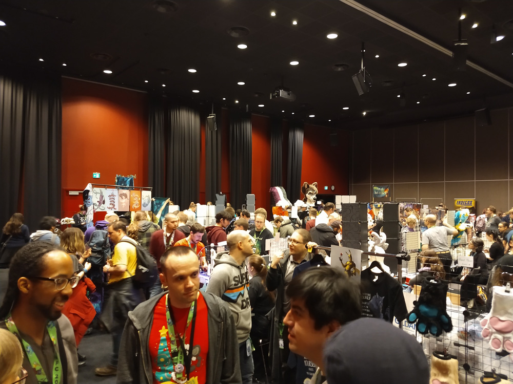 We dragged ourselves out of bed at 10 after the wild party last night and had breakfast with Yamavu, Ekorren, Chiros, Renée and Ethan. Skippy joined at 10:59, maxing out on sleep while still making it to the tasty buffet. I finally managed to get a waffle at the waffle station, which was hard enough since each waffle takes 4 minutes to make and there was always a line so far. After that, I visited Paco's table in the Artist Alley with Henrieke. Kéké also dropped by.