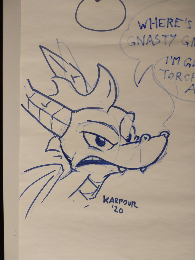 We got up at 10 and had breakfast with Tabbie, Yamavu, Claspo, Yotie and Henrieke. I did some last work on the Powerpoint Karaoke slides. Henrieke wasn't feeling too well so she went up to the room again for a bit after breakfast. I sat together with Yotie, Ekorren and Chiros to chat a bit, then I played some Bubble Bobble with Ekorren. Chiros took over after about 20 levels and we went all the way to level 100, but got the bad ending of course. It's very hard to get the good ending in Bubble Bobble. We went to the arcade a bit, while outside the arcade the Smash Bros tournament was going on. Outside the arcade was a flipchart, so of course I had to draw a Spyro on there.
