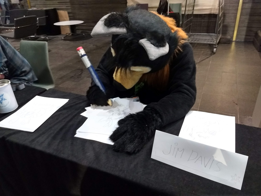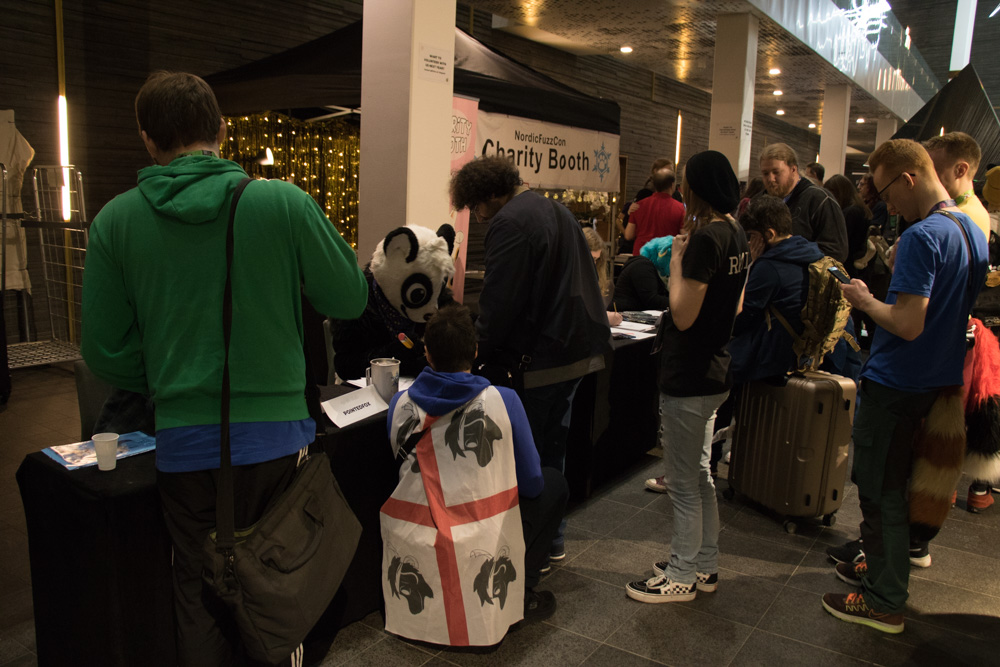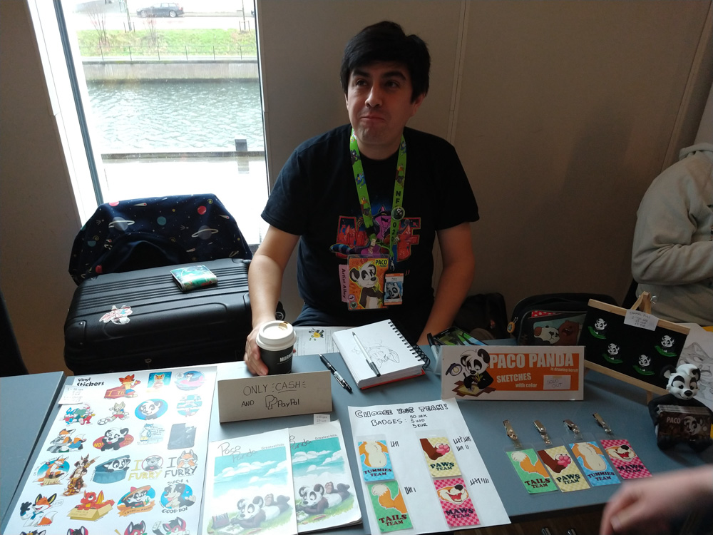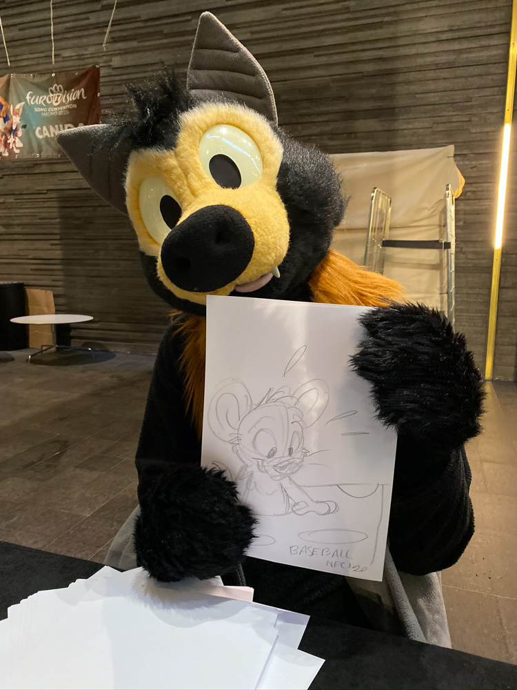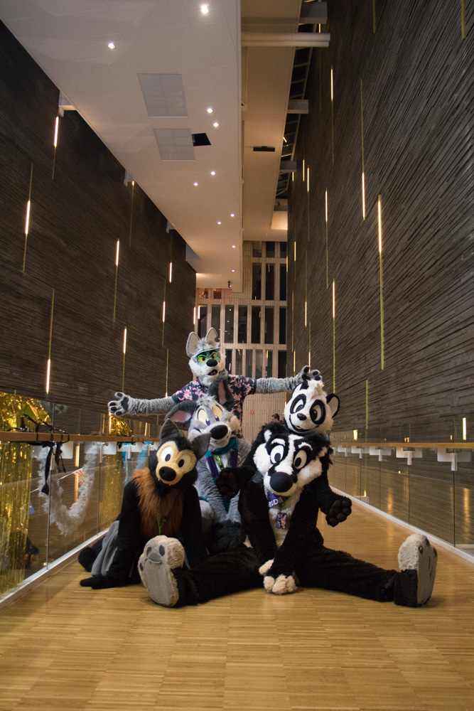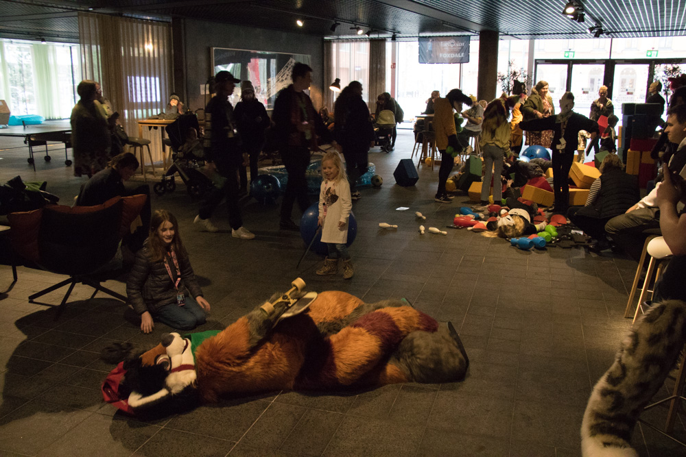 Baseball did about 10 drawings and got to sit next to PointedFox. After an hour Paco came to take over, and make even cuter sketches for anyone willing to donate to the cat shelter. Gatorguts also sat at the table after 18:00, making sketches. Baseball also got a cute drawing from Henrieke! After being done, Baseball went back to the room and I met up in te lobby with Henrieke, Mag, Tabbie and Ekorren. I took some photos of Paco, who was now drawing for charity. Skippy, Procy and Chiros joined as well and we all had Lasagna at the buffet in the hotel.