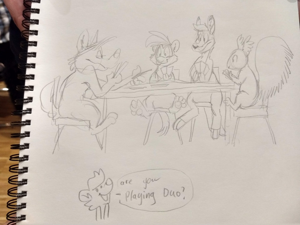 It was me, Henrieke, Chiros, Paco, Procyon, Mag, Yotie, Yamavu and Tabbie on the room. We played some Drawful, produced some great works of art, then some Faking it. Around midnight Geekfox also joined. We played some more Quiplash with prompts written by Mag and Jym in a drunk state. Henrieke and I scribbled a bit.