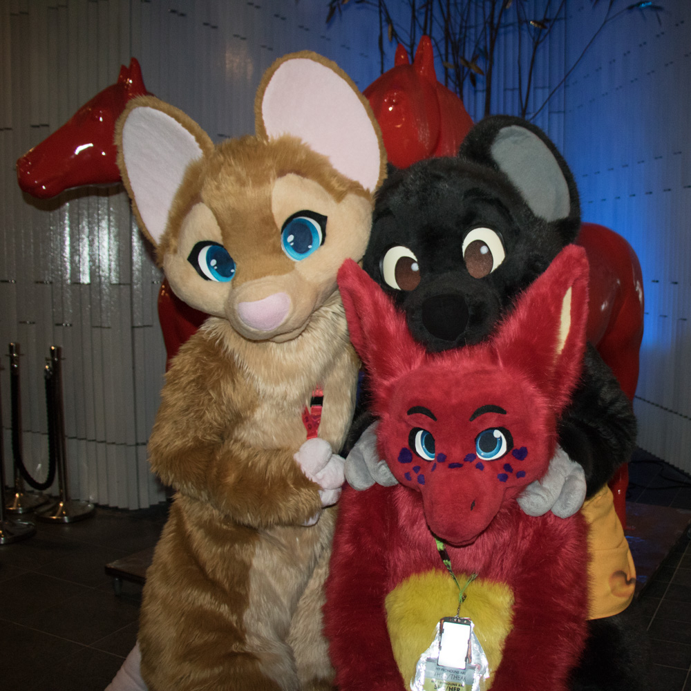 All the critters then went to check out the inflatables panel, sadly no sea dragon was in sight, apart from Speckles, the smaller orange one. After that they all hung around in the lobby, and Baseball drew some fine art for Renée in the Artist Lounge. I went downstairs again soon and sat in the Artist Lounge for a while, chatting with PointedFox while Henrieke did a trade with Ciderbun.