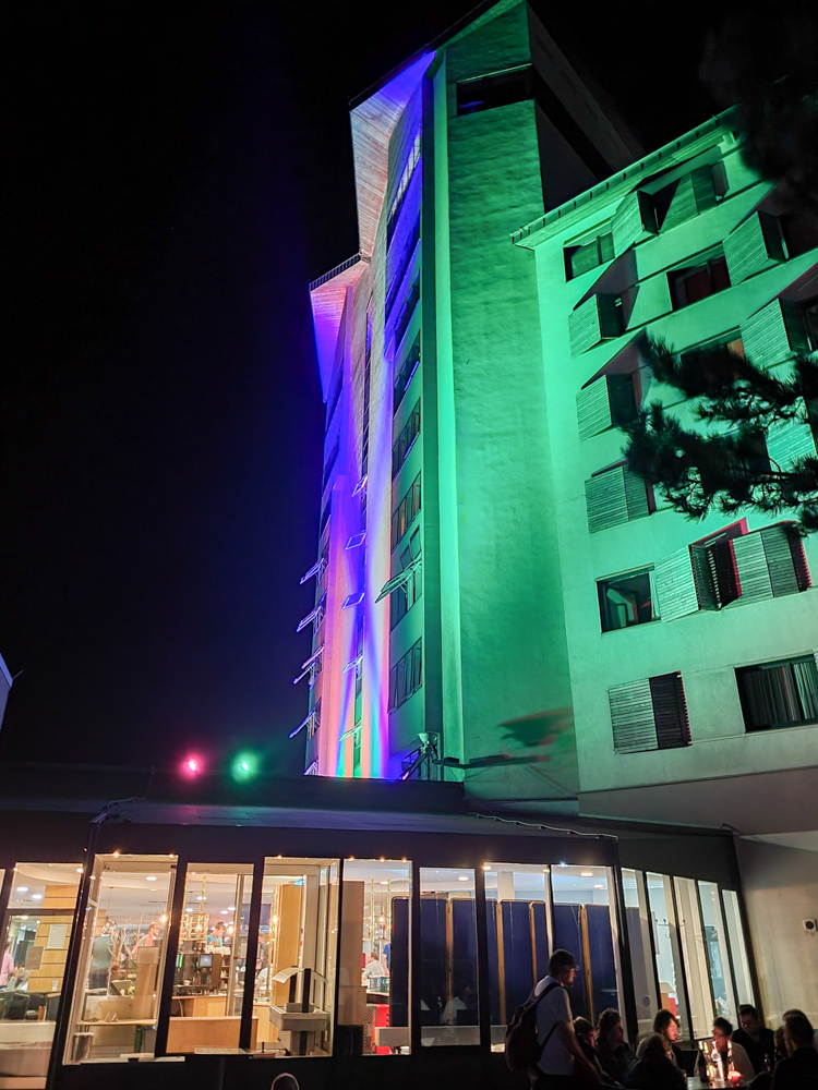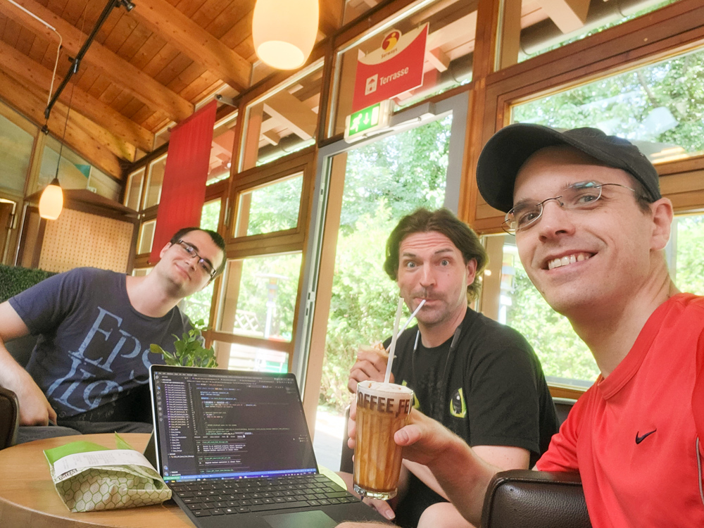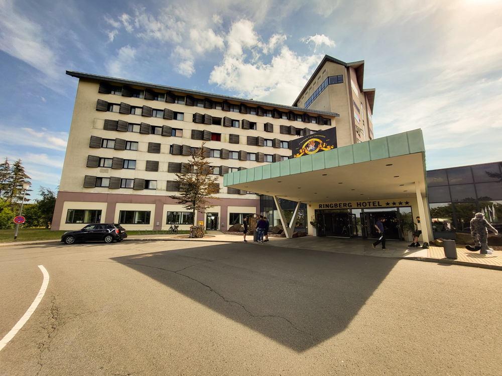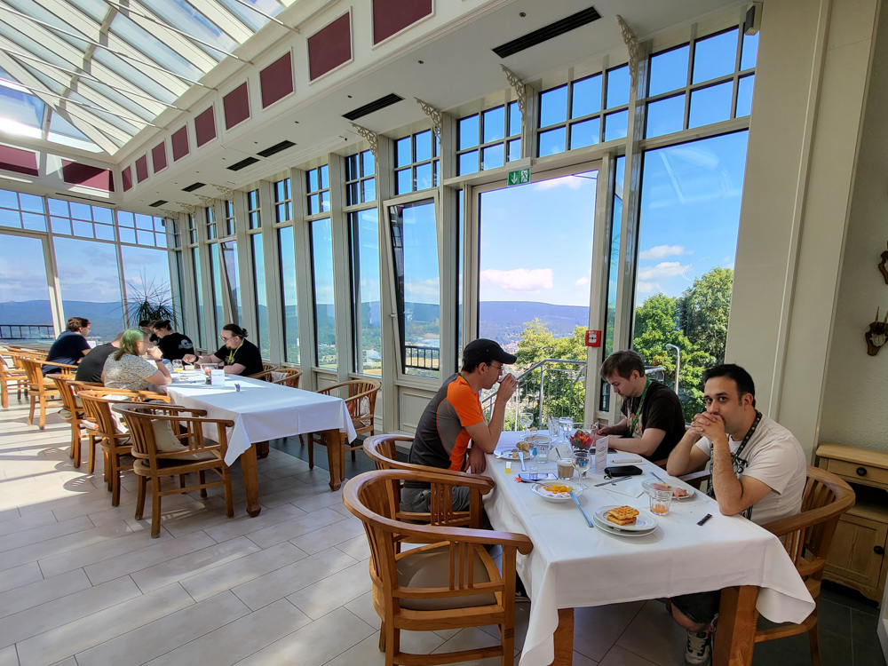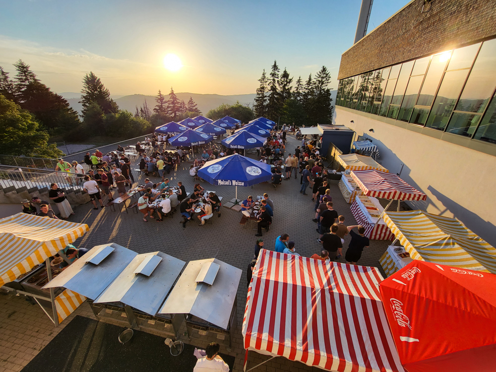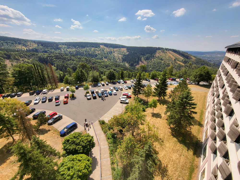 We arrived at REWE at around 16:00 and spent 60€ on drinks and snacks, then we drove up on the Ringberg. We dumped our stuff in front of the hotel and I parked our car on the more remote free parking lot. At the hotel entrance I ran into BBF, we chatted for a little bit, then I got our room key and hauled my junk onto the pre-chilled panorama suite. Today it was 37°C so having one of the few rooms with an air conditioner was a blessing.