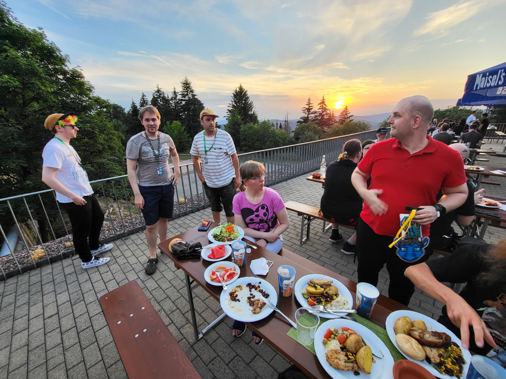 Shortly before 21:00 Mag, Ekorren and Yotie also came down to the terrace. They opted to not go to the BBQ, which they regretted since none of the restaurants in Suhl delivered at this time of day anymore and the hotel bar also offered no food (except some gross pre-packaged sandwiches).