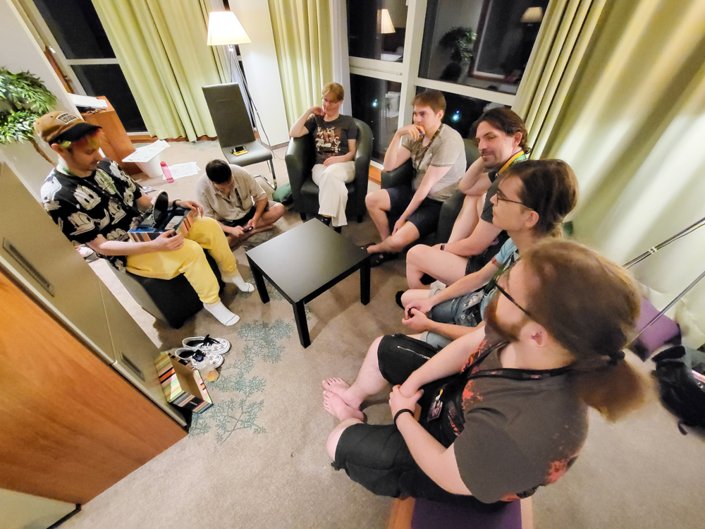 Baseball then took a short break in the room. I chatted a bit with Mag, then Baseball went down to flap his wings a bit at Krauti's dance. He also met Zed there. After it got a bit too warm, Baseball went up again and I took a quick shower. Henrieke, Mag, Ekorren, Yotie were there, and Yamavu, Atura and Turiv joined later. Yotie had brought Wavelength, which we played together. Chibinoms also dropped by in suit and since his voice reminded me of the "Fortnite Cola" kid, I showed him the video which he ended up quoting the rest of the con. After 2 rounds of Wavelength we switched to playing Jackbox on Yotie's Steam Deck connected to the big TV in our room. We played some Faking It, Quiplash and Split the Room.