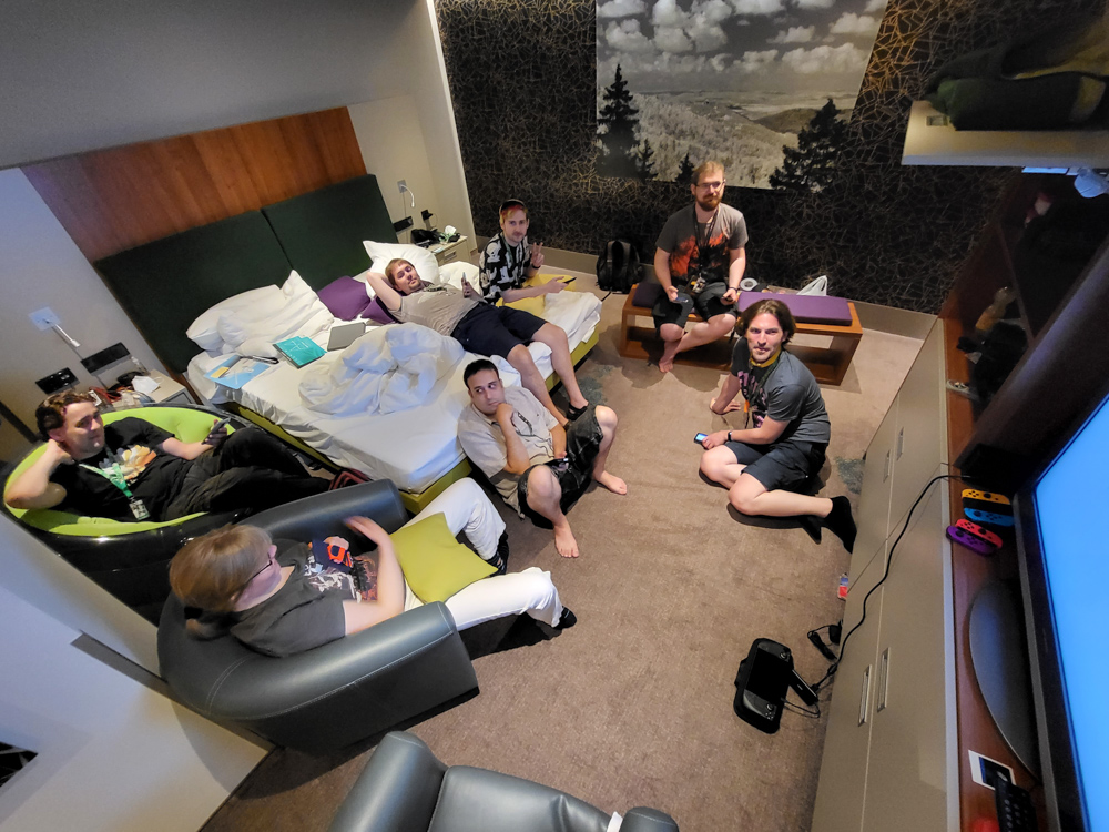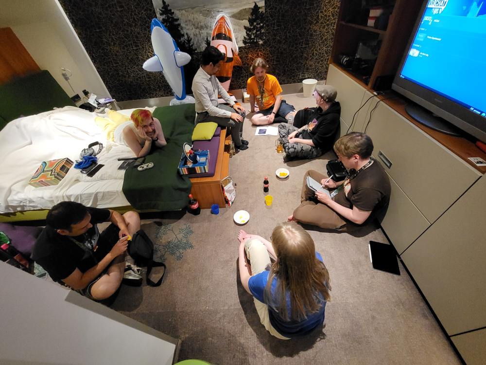 We then played some more Jackbox games. Yamavu and Sertro also joined and we played some more Faking It, Role Models and Trivia Murder Party while the floor was vibrating from the room party below us.