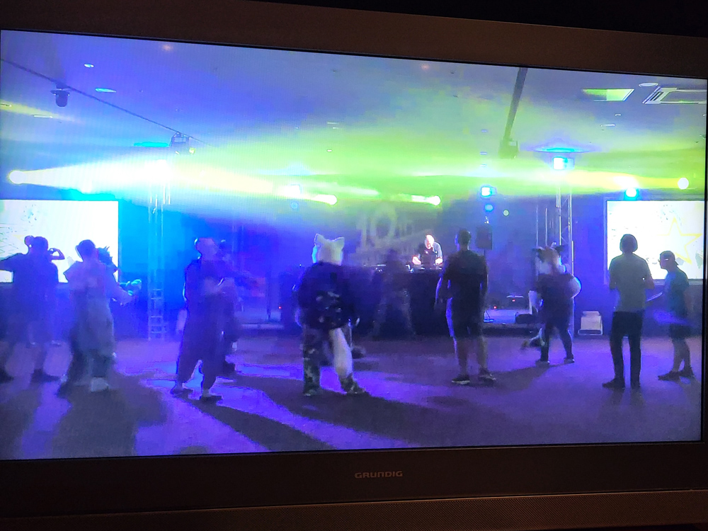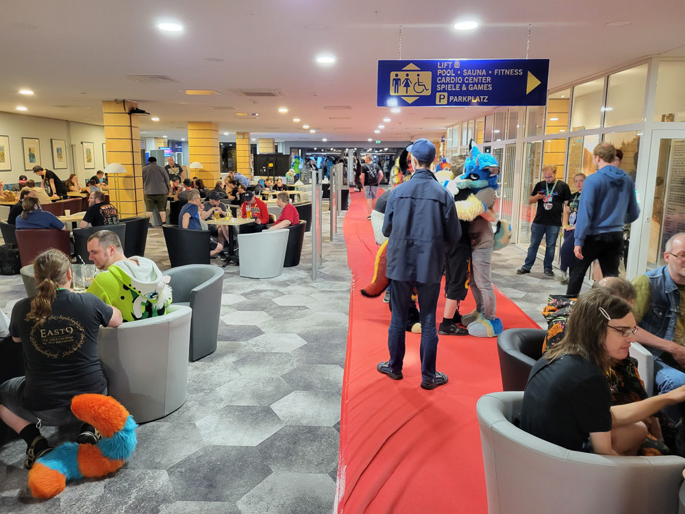 Baseball then said hi to Shorty at ConOps, who promptly gave him a donation can and sent him to get some money for the charity in the lobby. This was made much easier by the fact that the hotel only allowed cash payments, so almost everyone had plenty of spare change to donate to "Tierisch Grenzenlos E.V.". After about 15 minutes Baseball had collected about 95€ and delivered the can back to ConOps. Since the dance was already going on, Baseball dropped by there for a bit and met Yamavu, Sertro and Atura. He also ran into Krauti, who told him that he'd be DJing soon.