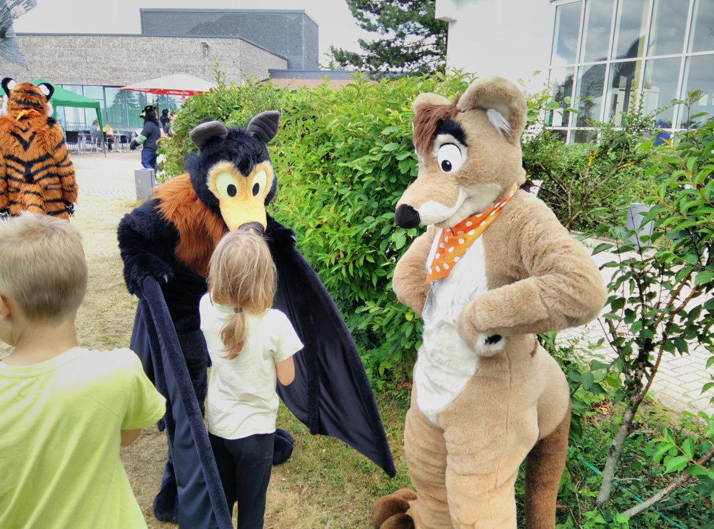I went back to the room and cuddled a bit with Henrieke after preparing Tyler and Baseball for the fursuit parade. I wore Baseball with the giant wings, Henrieke wore Tyler, who hasn't been at the Ringberg for quite a while! Baseball and Tyler were just in time for the start of the parade. They also met Luno Roo, another native Australian critter. The media was present and they filmed a piece for MDR.