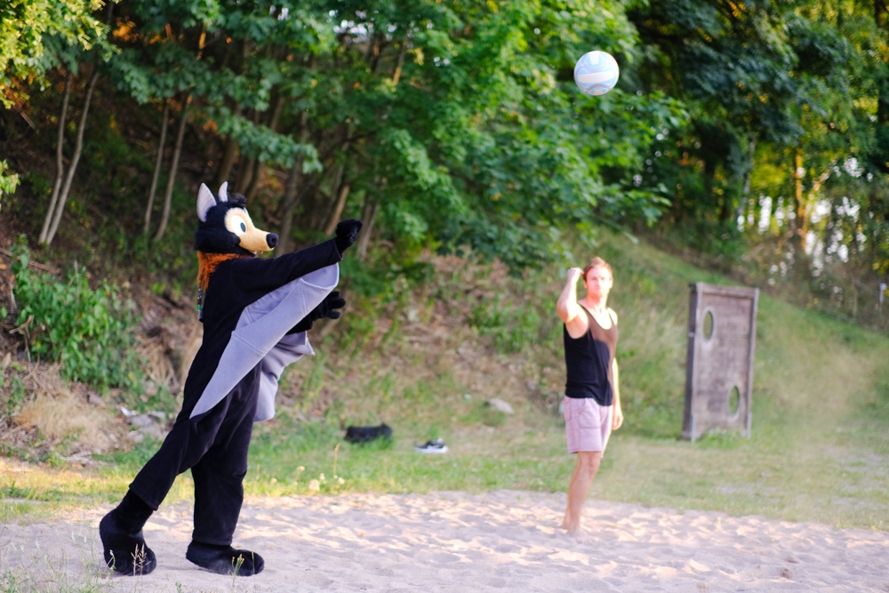 Eko played some Cuphead on Yotie's Steam Deck. Everyone except Ekorren and Henrieke left at 19:30 and we agreed on meeting at the pool in an hour. Yotie and Mag went downstairs to take some photos and Baseball joined them soon, getting some slav-squat photos taken and joining some people playing Beach Volleyball. I guess Baseball Bat changed to Beachvolleyball Bat for a while.