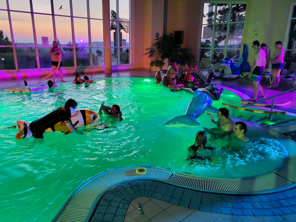 Yotie and Mag joined as well later. We had a lot of fun in the pool and left at 19:40. I got the room key from Henrieke who was sitting outside with Ekorren and BBF. I quickly changed out of suit but sadly just missed BBF who promised to film a bit at the 90s party which just started. I met Chibinoms downstairs and gave him a Cola which he very much appreciated, then figured that Baseball should be at the 90s party. He went there with Mag and had some fun times. Baseball also played some amazing tunes on Mag's Casio keyboard and impressed BBF with his musical talent.