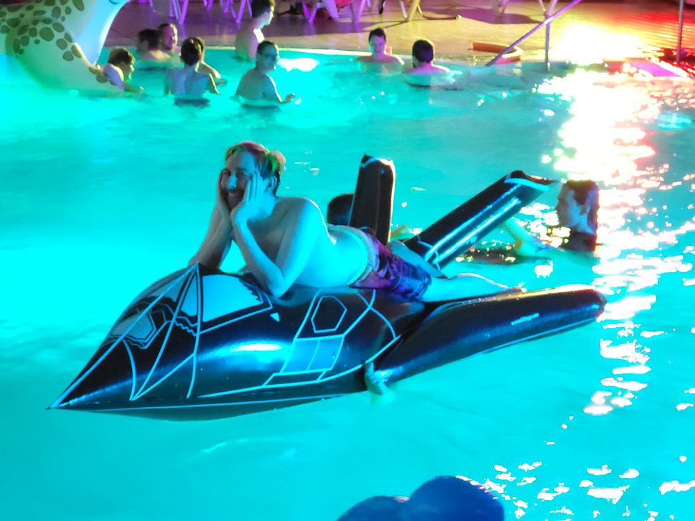 Baseball asked if any more charity collection was needed, but since someone just did that it didn't make too much sense so he went back to the room. Then Henrieke, Mag, Eko, Yotie and I went to the pool. Yamavu and Atura also joined later. I brought my inflatable dolphin and fish. Some other people also brought inflatables, including a huge inflatable stealth bomber that was right up Yotie's alley.