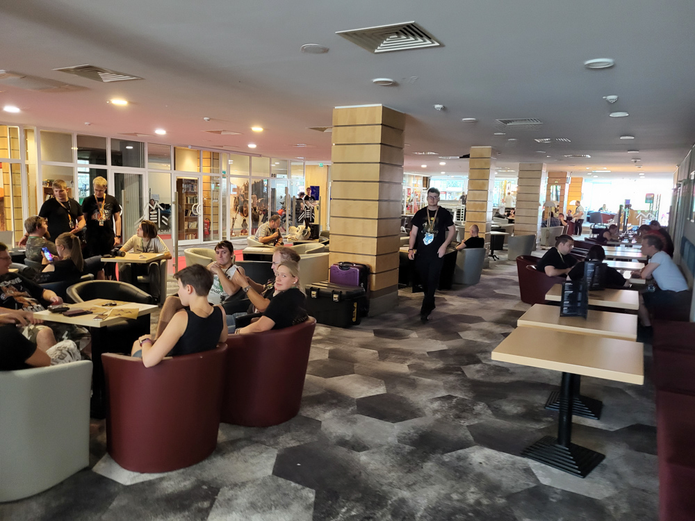 I went inside again as it was really hot outside and inflated the second inflatable chair in our room with a pump I borrowed from Silvi. Henrieke was done with her comic by now, so we went downstairs. The Dealers Den was already closed, so we went to the Game Room and played some Mario Kart Wii. Then we sat in the lobby with Ekorren Mag and Yotie and had some mediocre burgers. I left early as Sertro and Silvi were at the pool, and the Sea Dragon was there too!