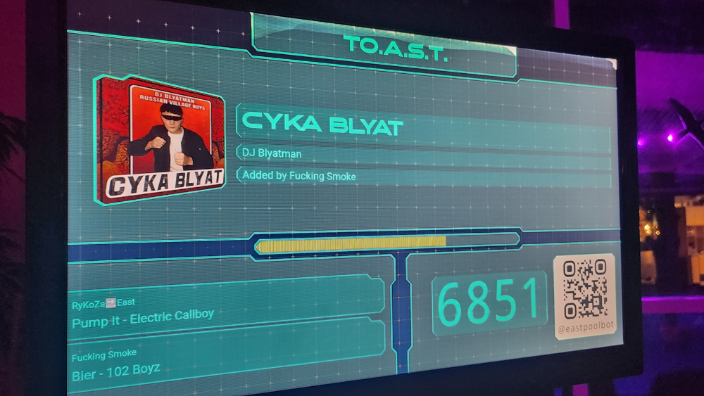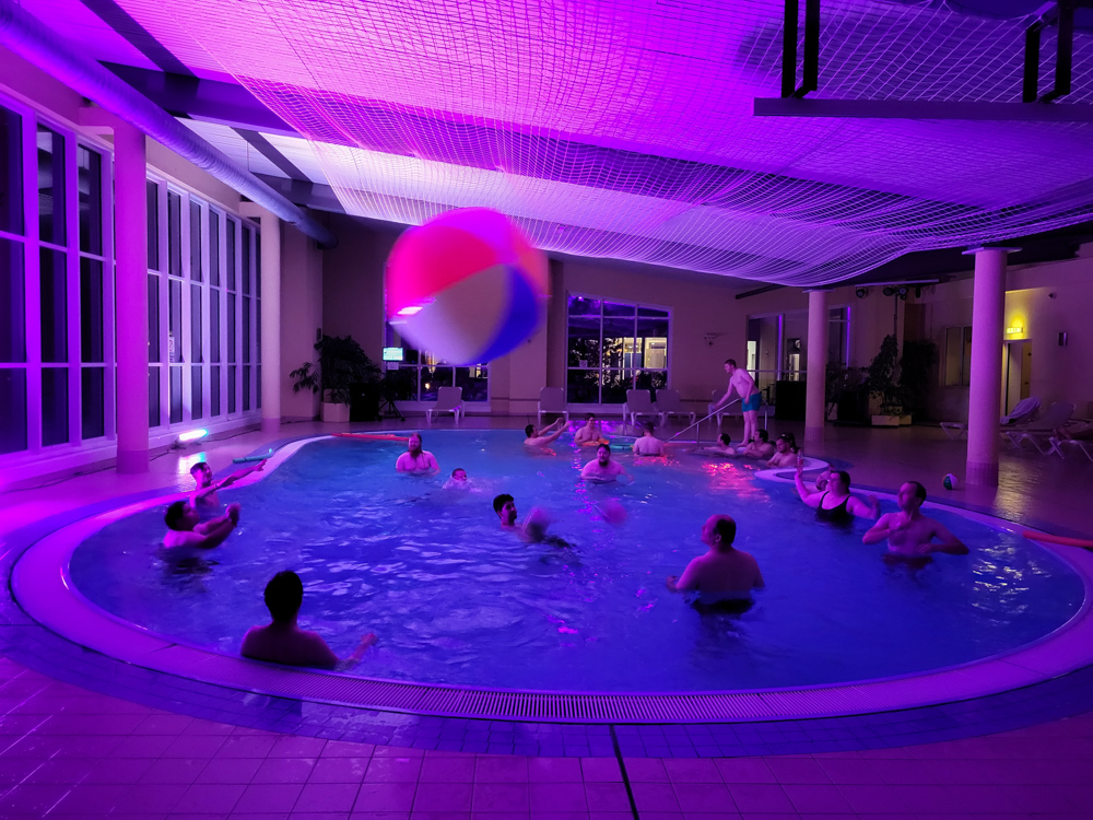 I went to the lobby to look around and saw Yotie and Mag were back, so I went to their room. We decided to go to the pool. Henrieke stayed on the room. The atmosphere in the pool was great, there was music and you could add your own tracks via a Telegram bot. People had fun with an enormous beach ball! Yotie sent Cbat to the speaker, which was the current meme song in our friend group for some reason.