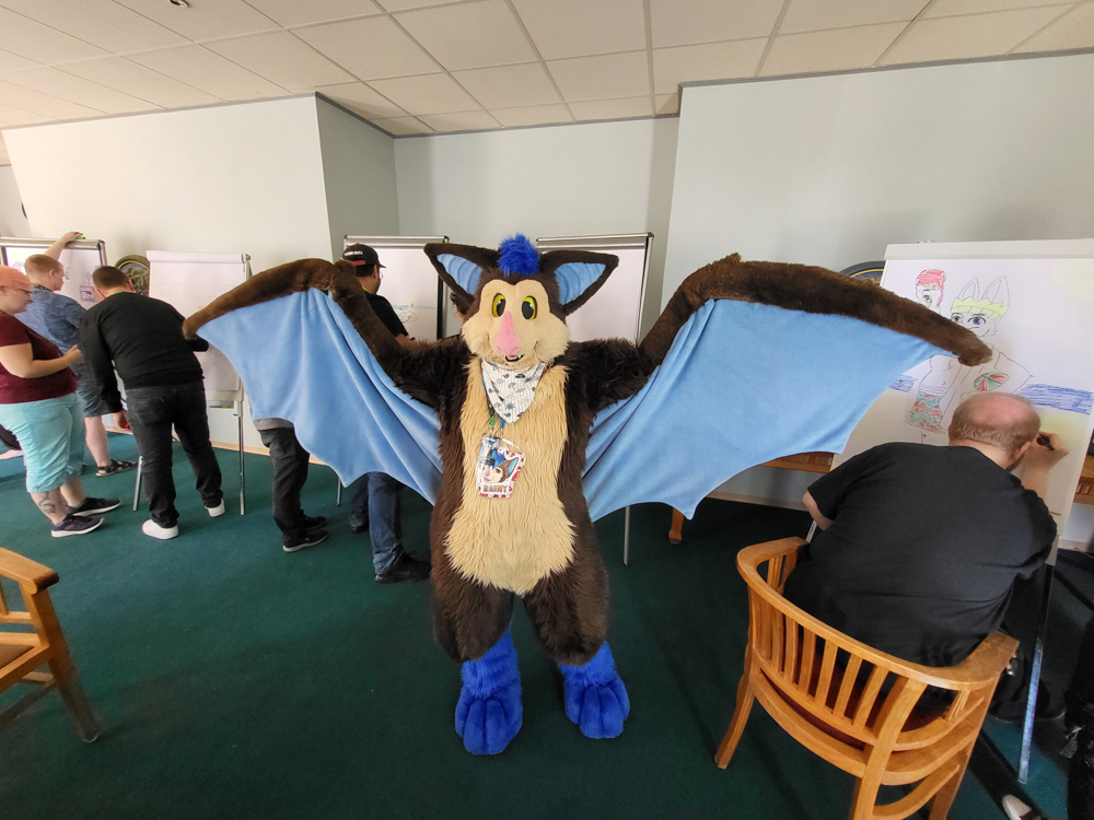 In addition to the legendary butter dispenser, they now had an automatic pancake machine! What will these German engineers think of next? At 11:00, an emergency GSM broadcast went off, which prompted every German to say "Alarm.. Alarm", in reference to an infamous German meme. We spent some time in the downstairs foyer and I arranged some Artist Alley tables for Henrieke and me. I also ran into MrPlymouth and his 70s portable camera. Henrieke and I checked out the speed drawing panel. It had already started, but looked pretty fun! We also met a cute bat there!