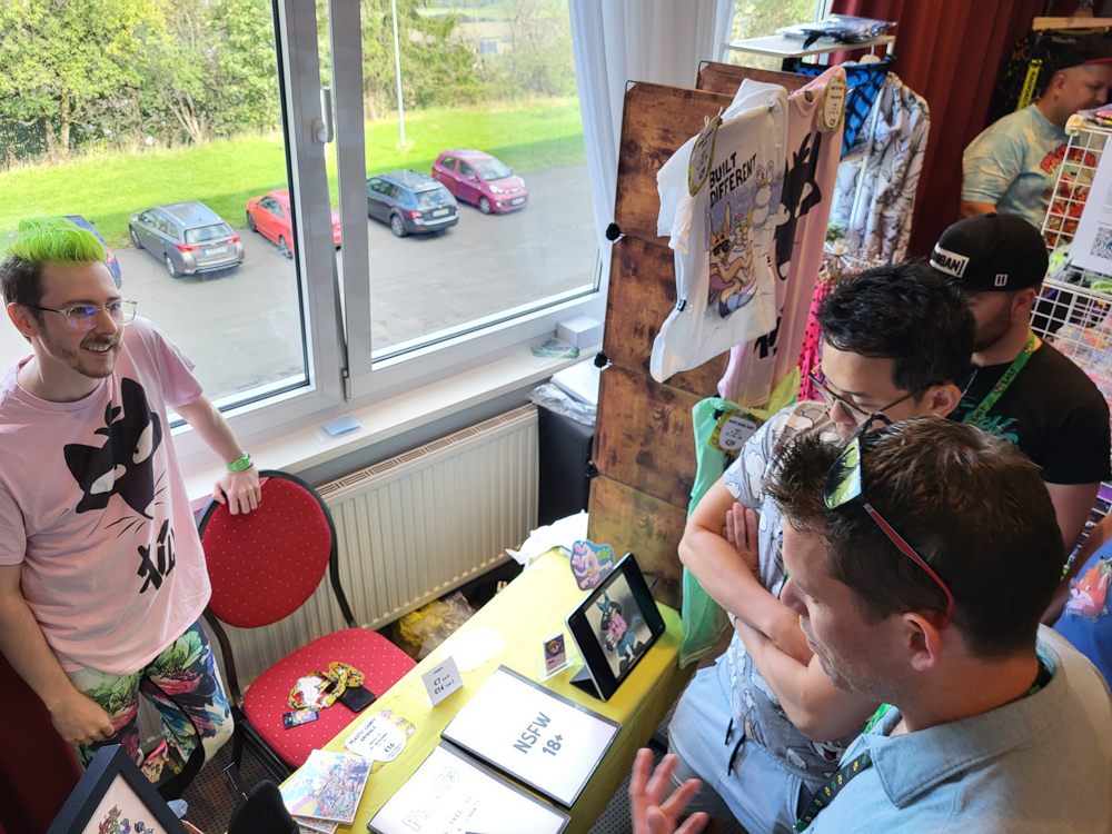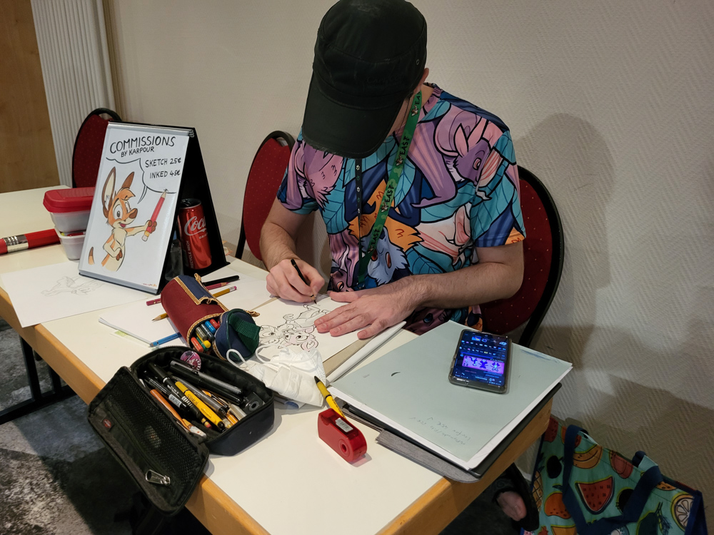 I woke up at 8:00 with a big headache. Henrieke and Mag went downstairs already to set up their tables, I had some ibuprofen and cereal and went back to bed. At 11:30 I went downstairs, relieved of my headache, and had some breakfast by myself. I went to Henrieke's table after. Today, Mag set up his table in the artist alley as well, as his spot in the Dealers Den was very hard to see and reach. I made a quick birthday drawing for BBF, which he picked up soon after.