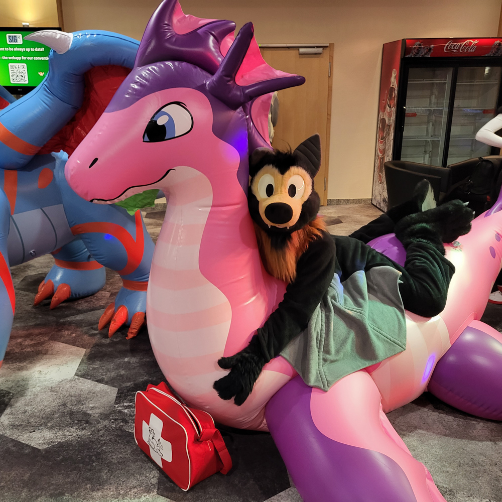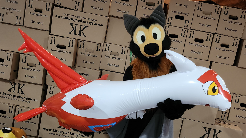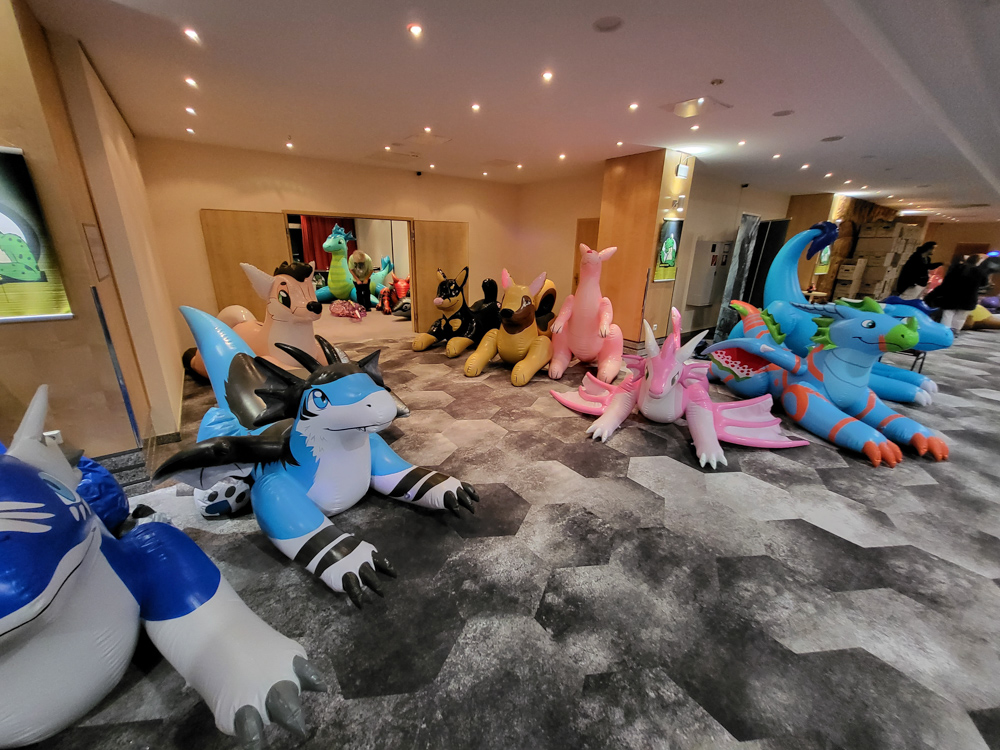 Henrieke and I stayed at our tables until 19:00, then we packed up, went to the room and had some cup noodles. I suited up and Baseball went to the inflatables panel, which was the biggest inflatables panel I've ever seen at any convention! Baseball met MrPlymouth and Aphinion there! Baseball went back to the room to ask Henrieke to take some photos, and after hanging out on the room, Yotie and Henrieke joined Baseball to the panel and took some photos. There was a nice Latias inflatable there too!
