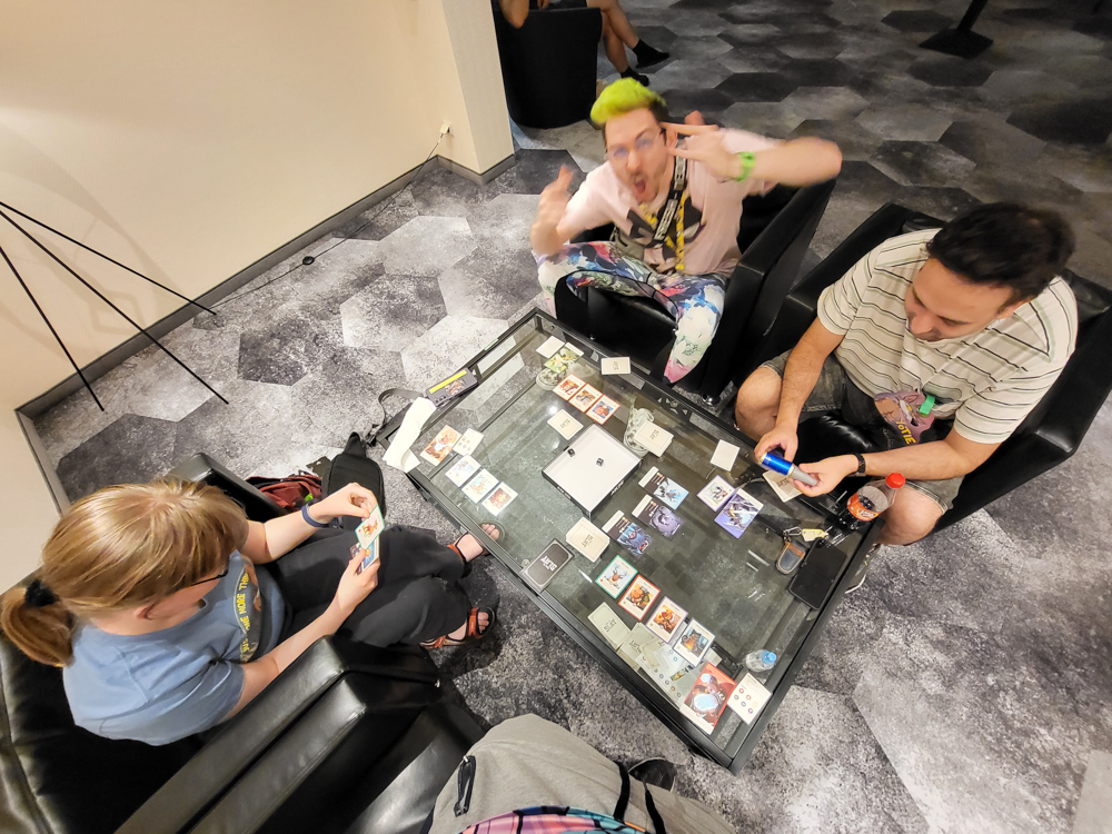 I went back to the room at 17:45 and went back to Henrieke's table after. There was a pub quiz going on, organized by JohnyBCoon. It looked really fun, hopefully we can join next time! I helped Henrieke and Mag pack their things and we put the stuff on our room, then we had some currywurst with fries in the lobby. After that we went to play "Here to Slay" in a quiet corner of the hotel.