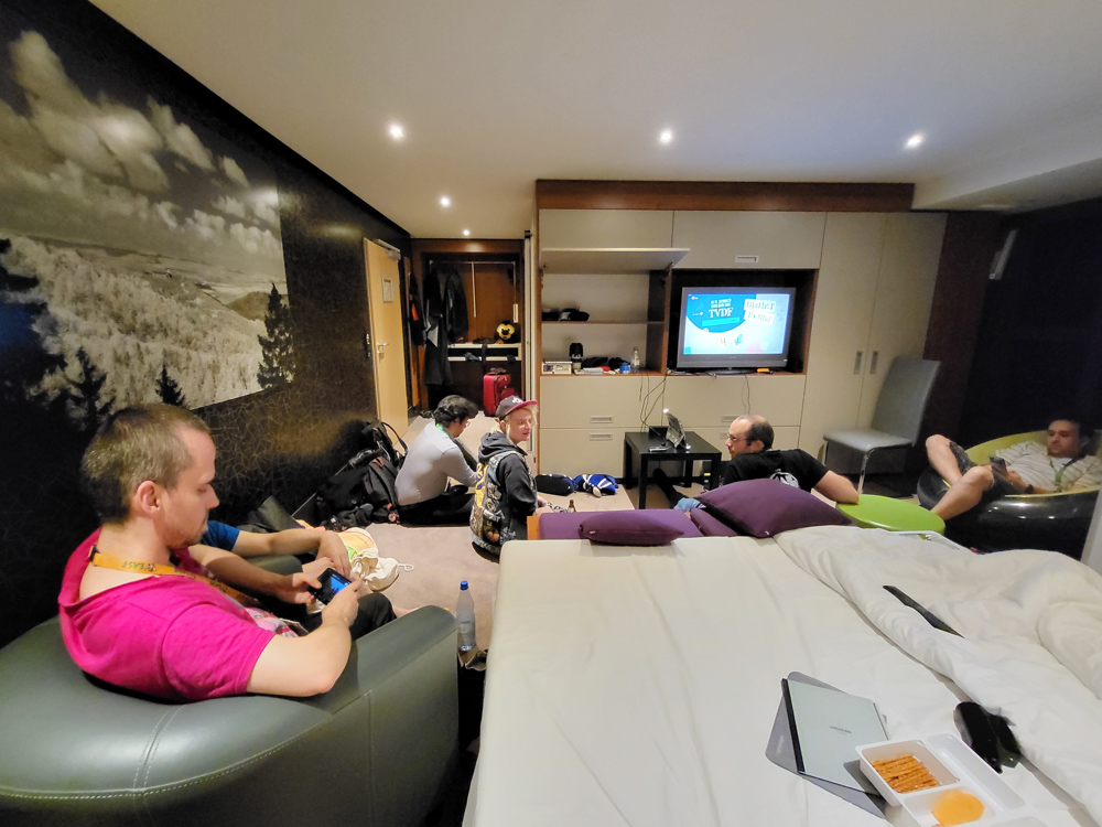 Yotie and Mag arrived the night before. Henrieke was still working today. She brought some fries and fried food from the snackbar, and we left around 8. We made a stop in Veldhoven to pick up some things from there, Henrieke's mom was being super nice and gave us snacks and drinks for the ride. We continued soon after and arrived at our roadside hotel after midnight and flopped on our beds.