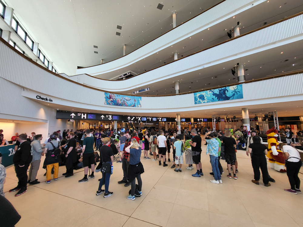 Since we were starving, we went to McDonald's at Hamburg Dammtor right away for lunch. The food there was.. very mediocre. The handy thing was that our ICE went directly to Hamburg Dammtor, which is literally next to the Radisson and the CCH where the con was held. So after our lunch we walked across the street, and the receptionist was nice enough to let us check in 2 hours early. I met Gwyndolium and Skittles at the elevators. We unpacked our things and went to get our badges. Due to some mistake we weren't marked as staff, fixing that took about half an hour of waiting. We also tried getting fursuit badges, but the desk wasn't open until 16:00.