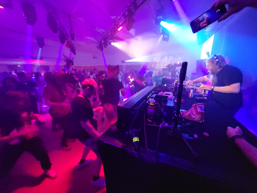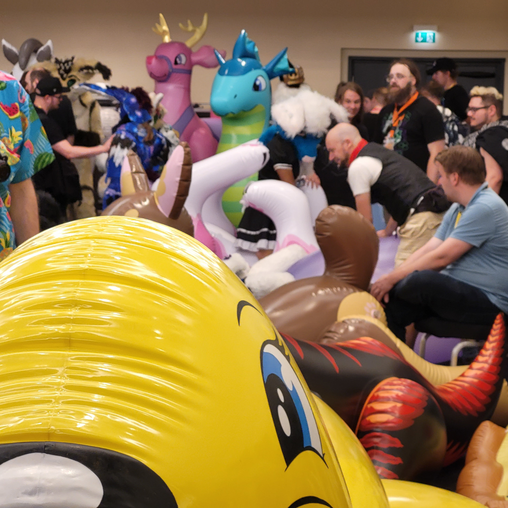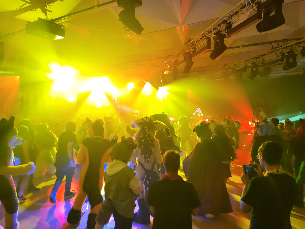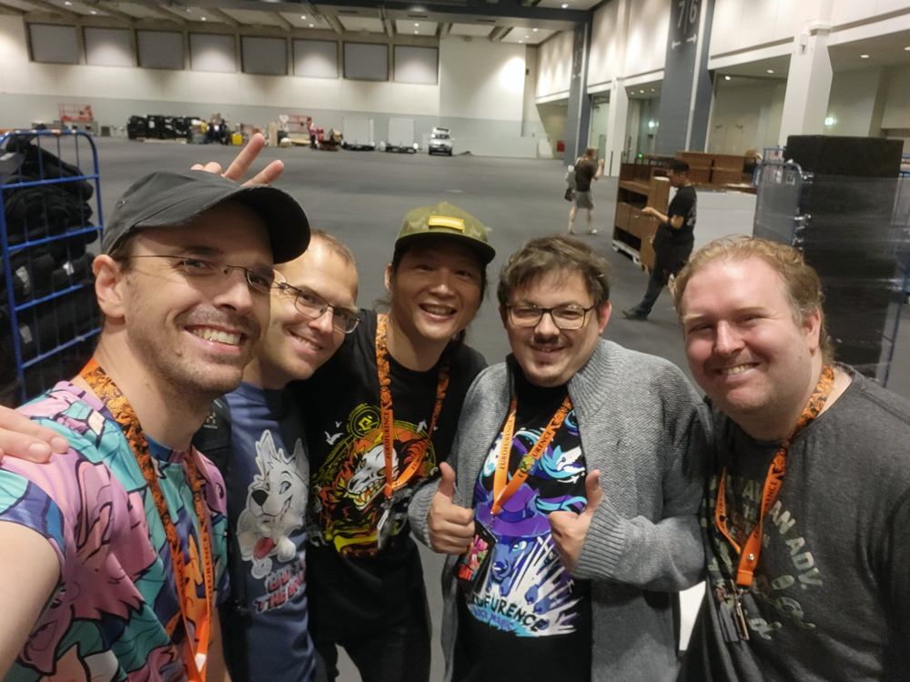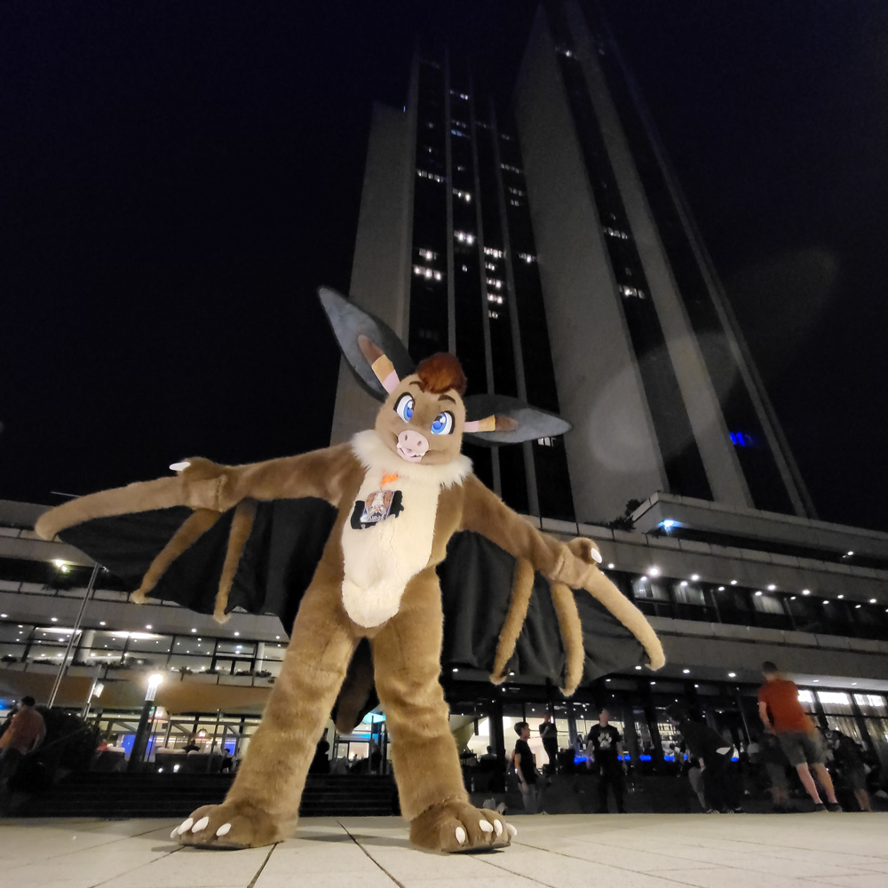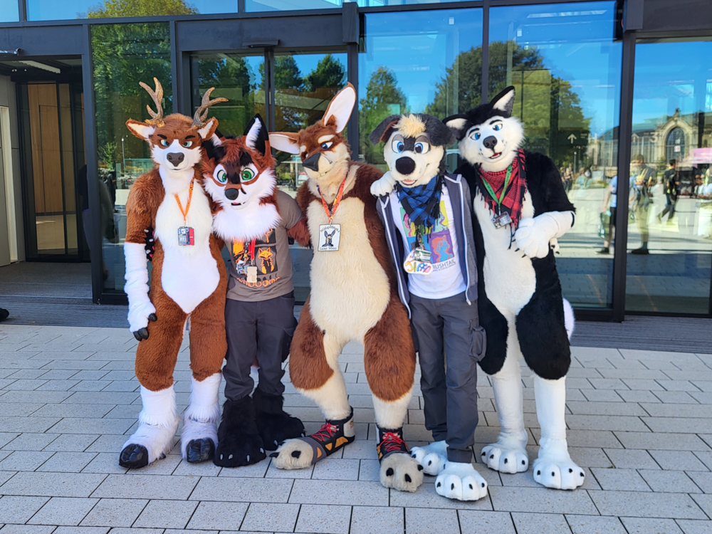 I got up at 11:00, sure is nice to sleep in for once. I had some Knäckebrot and Nutella for breakfast, then suited up and did the fursuit parade as Tyler with Chiros. Sadly Tyler is in dire need of repairs, turns out foam gets a bit brittle after 14 years. Tyler met Shorty and Zed in the parade. It was really hot outside, and sadly the ground was also a bit more rocky than anticipated, so Tyler took some shortcuts to get to the end faster. I got out of suit very quickly after that, took a shower and wrote with Henrieke a bit on Telegram.
