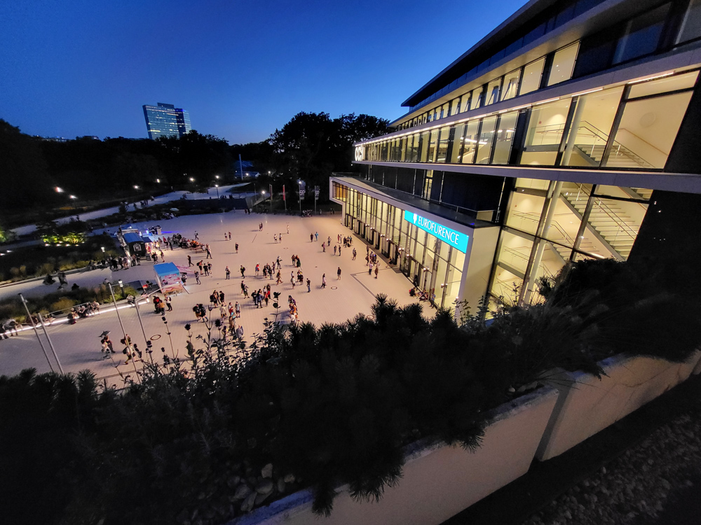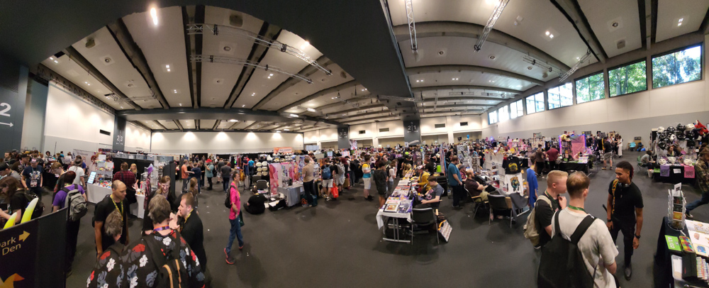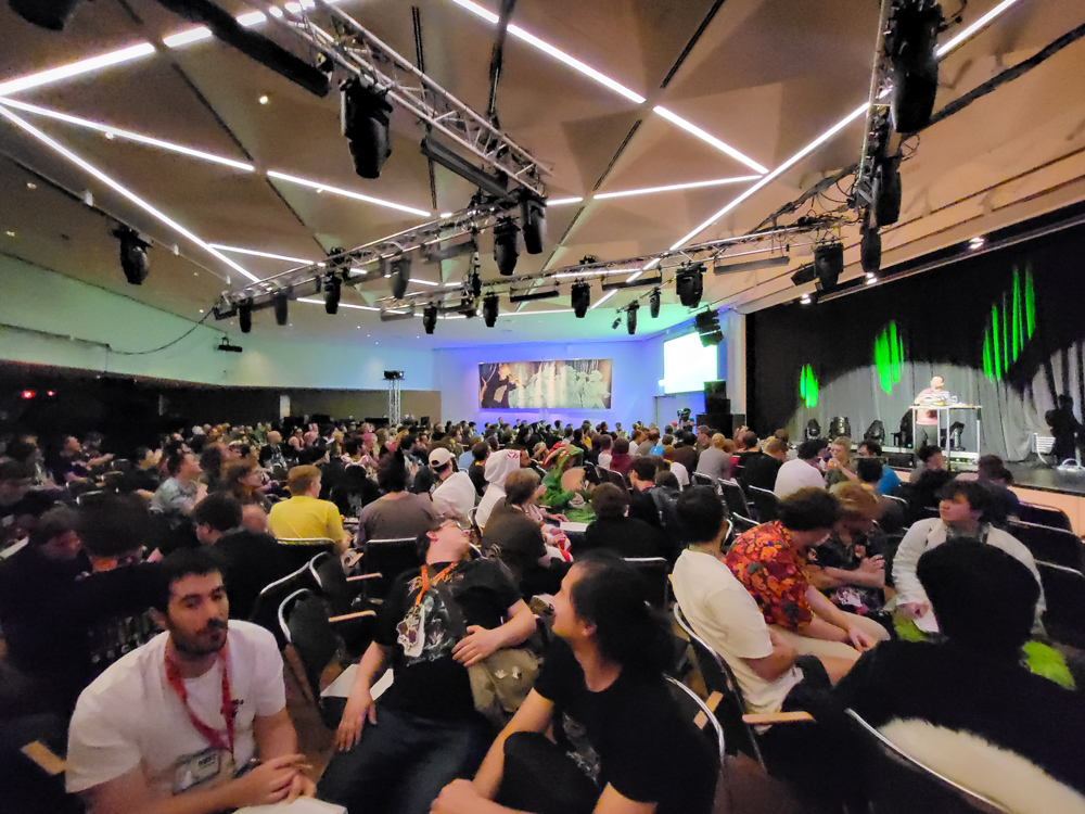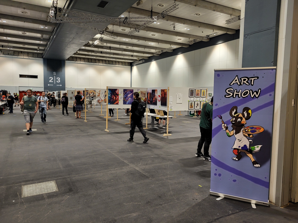I went outside a bit and met FlintGlomcat there, first time we met in real life! I went back to my room and Shorty dropped by. We planned to go to the steam sauna, sadly when we wanted to meet up Shorty wasn't there, and the sauna was almost closing. I went up to the room and met Chiros there, so we decided to check out the sauna, even if it was just for a few minutes. It was very nice, too bad it closes already at 21:00. We managed to lock ourselves out on the balcony - which happened to have a very nice view on the CCH and the plaza in front of it. Eventually hotel personnel saved us and we went back to our room. We watched some Casiopea and Synthwave videos, then Chiros suited up and we went to the art show, where Chiros and Thabo were collecting stickers for the charity sticker wall, which would be auctioned off later.