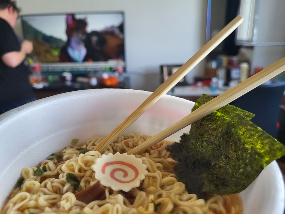 I had some instant ramen for lunch and watched EF Prime on our TV. Then I went downstairs to meet Shorty, who showed me the staff lounge, which was a little room filled mostly with instant ramen, coffee and slushie machines.
