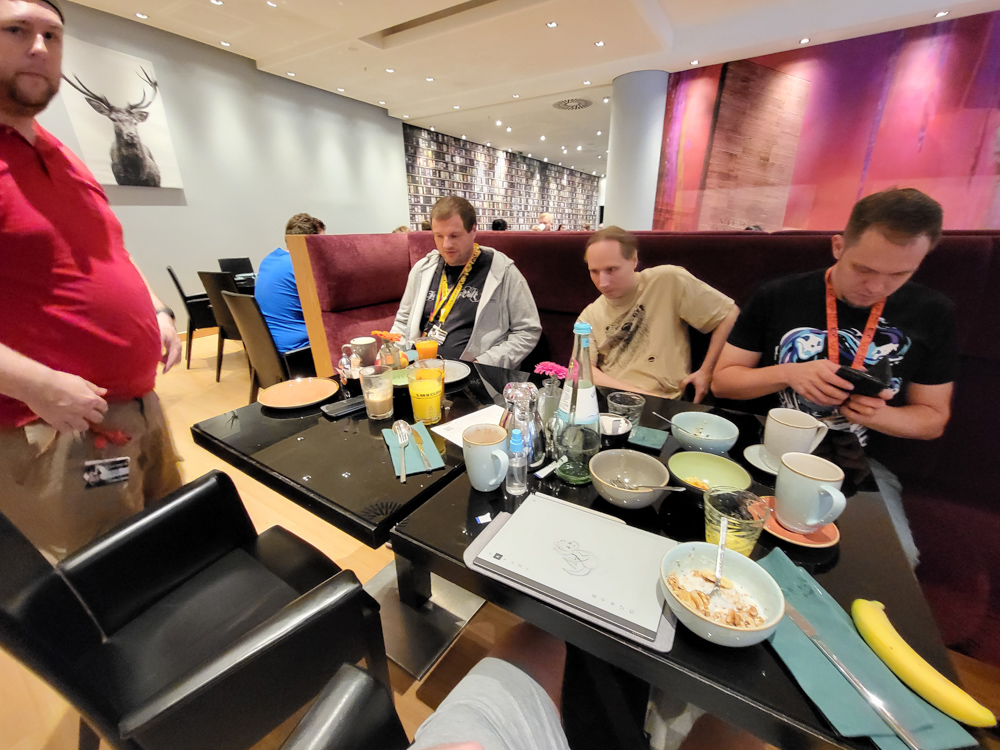 I went back to the room and watched a bit of PPS with Chiros, then both of us went to the staff buffet in the Radisson since the leftover food needed to go. In the lobby we met Steel. We sat at a table, later Neop also joined.