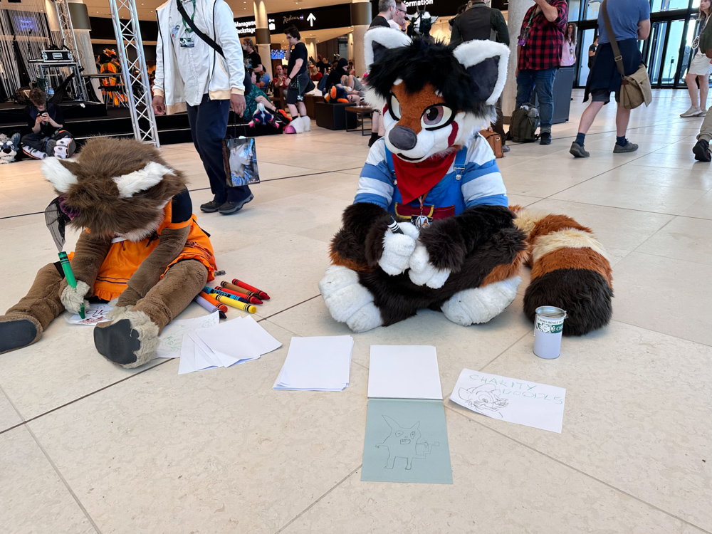 Steel already went downstairs and I joined him a bit later in the fursuit lounge. I tried suiting as his red panda, but it turned out he forgot the body in his hotel, so he went to pick it up. I wandered around in the lobby in the meanwhile. He came back and it turnd out that the suit actually fit me! So I turned into a rad panda for a while, participating in the fursuit group photo and collecting for charity by doing sketches with crayons for people. I also met Garrodor in the fursuit lounge!