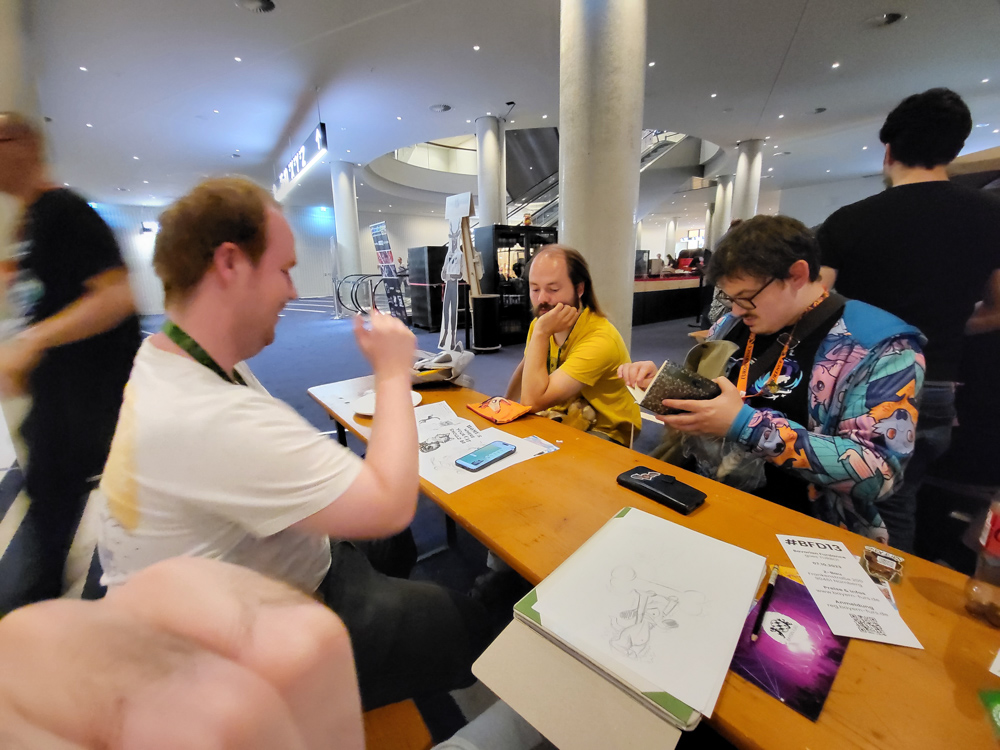 I sat there with Shorty, Kairan and TODO. Breakfast buffet was delicious, hopefully it'll be included in the room price next time. I sketched a bit on my reMarkable, and eventually we went to the art show. There we split up and I met up with Steel, who gave me some of his fursuit sized crayons he made fully from scratch. Steel and I went to my room and we chatted for a while, and we agreed on doing a field test with the crayons.