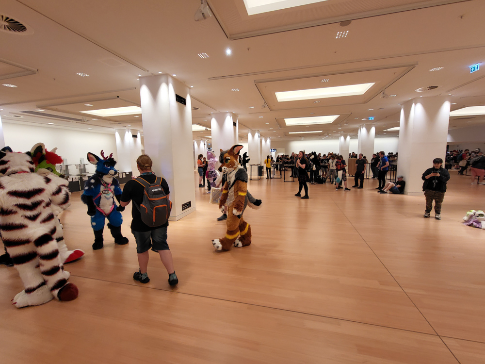 I decided to go to Rewe and pick up some food, also some COVID tests at the pharmacy. It was quite a walk to get there. I got back to the room a while later and stocked our luckily empty fridge. I took a quick shower and Chiros came. We went down to get our fursuit badges. I paid extra to get a Tyler badge since I forgot Baseball in Vienna, oops. I also brought some Coke Zero for Thabo and then strolled around a bit.